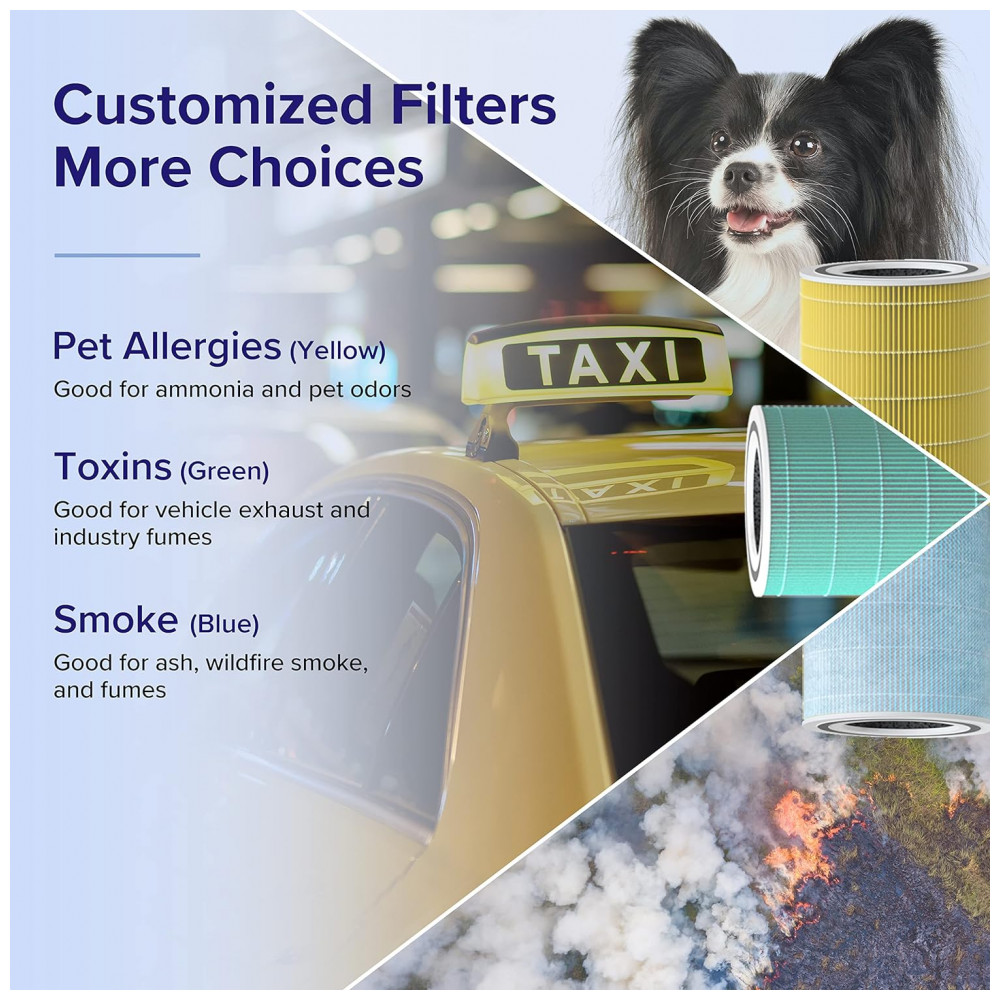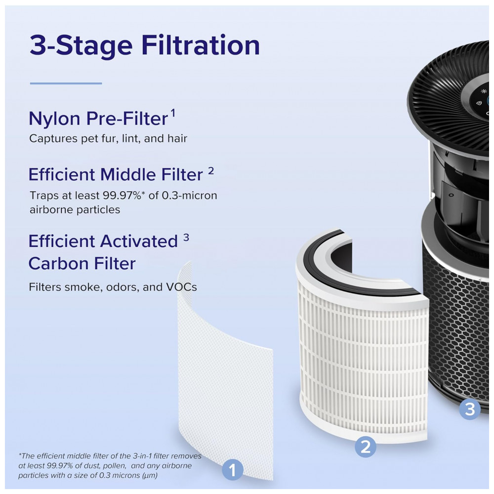 FILTRAÇÃO DE 3 FASES: A filtragem inclui um filtro HEPA True pré filtro H13, que retém pólen, poeira e pêlos de animais de estimação e um filtro de carbono ativado personalizado de alta eficiência que ajuda a neutralizar odores, fumaça de cozinha e fogo selvagem e COV.