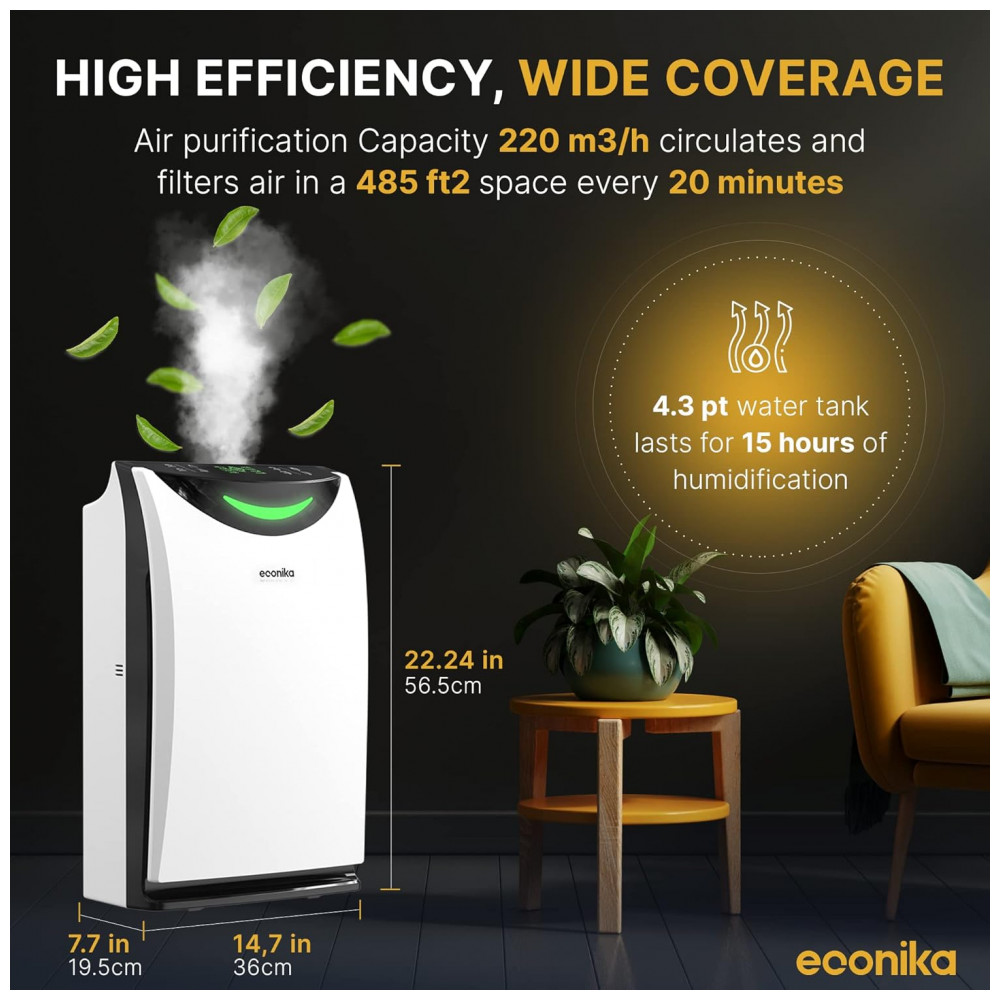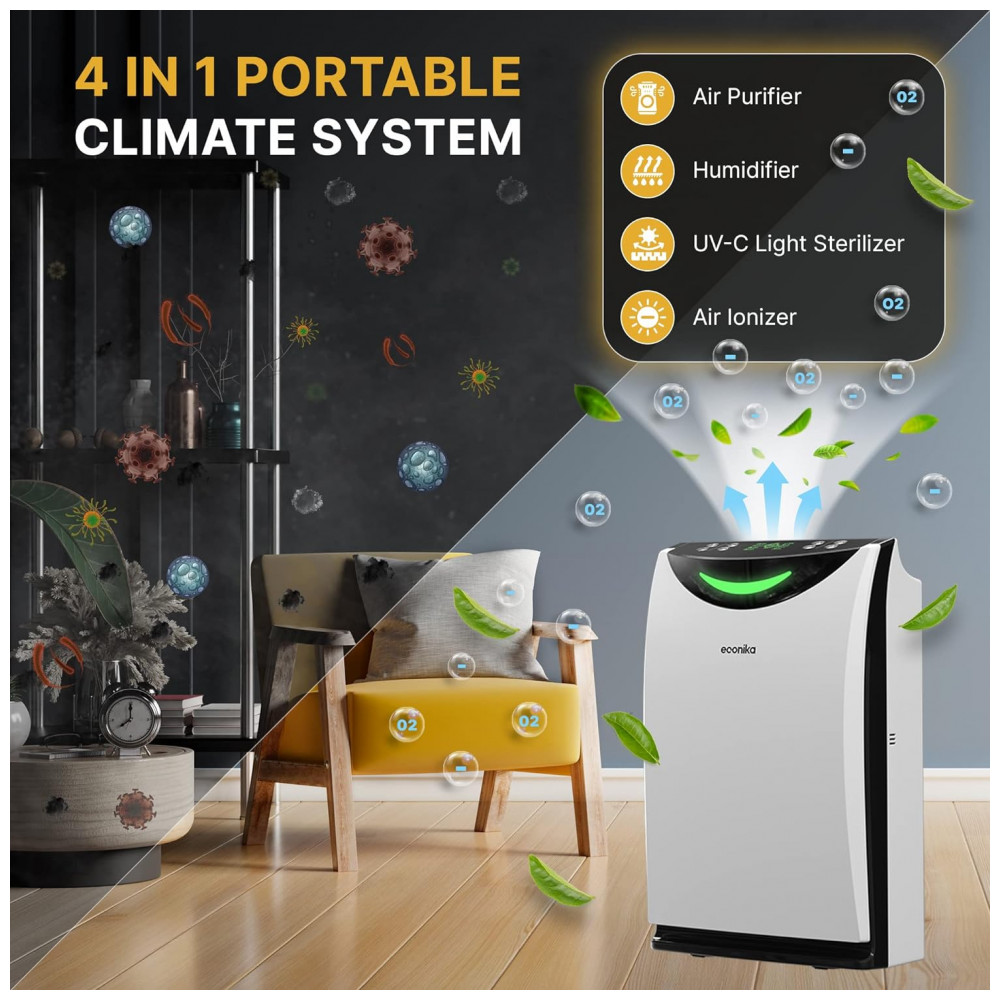 Purificador de Ar e Umidificador 4 em 1 com Filtro HEPA H13 e Lâmpada UV Cobre 65 m2 110V ECONIKA Branco