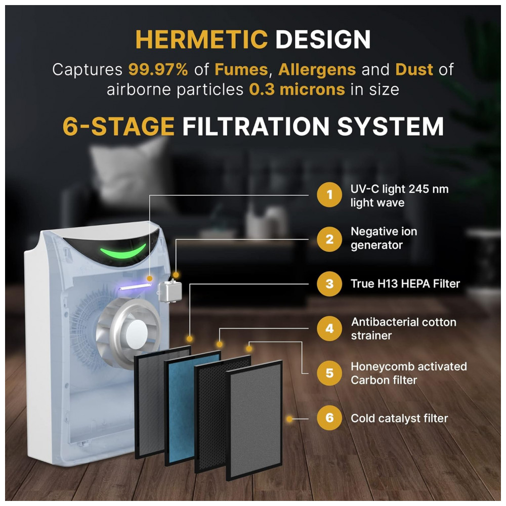 Purificador de ar de sala eficiente O purificador de ar de escritório manterá o ar fresco e limpo com eficiência comprovada de 99,7 de remoção de poeira classe H13 e mais de 99 de eficiência de remoção de bactérias.