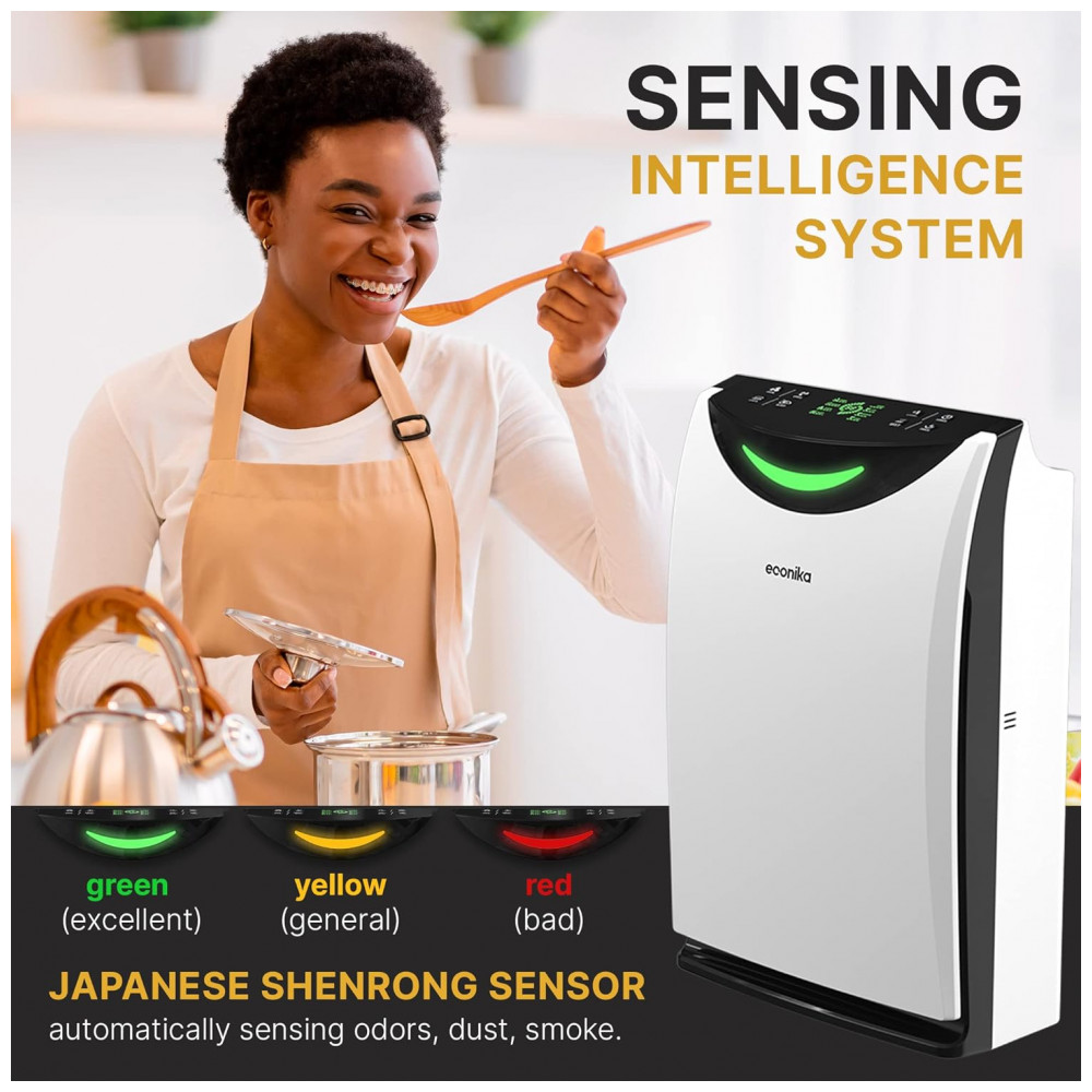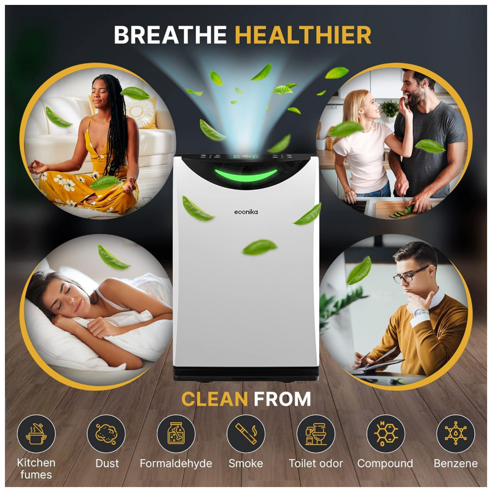 Respire profundamente Os purificadores de ar para casa são úteis com alergias e asma. O purificador de ar para salas grandes reduz alérgenos e poeira, bem como vapores nocivos de produtos químicos domésticos.
