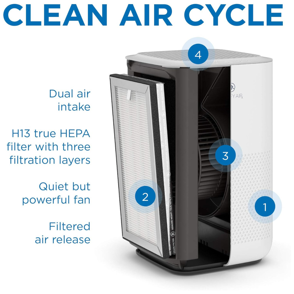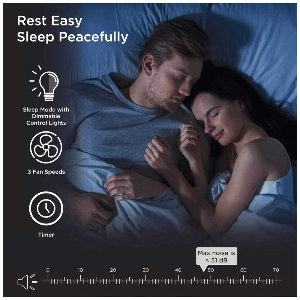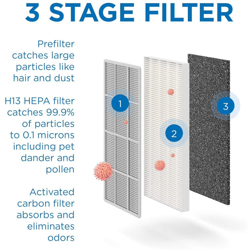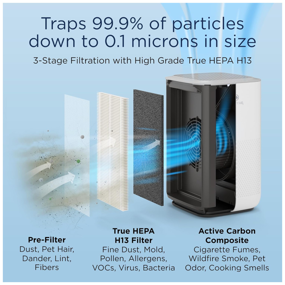 Um grau superior de filtros HEPA H13 maior classificação do que True HEPA remoção de partículas de 99,9. CADR de 150 Limpa até 30m em 30 minutos Perfeito para escritórios, quartos, dormitórios, berçários 3 velocidades de ventiladores Trava de segurança para crianças Temporizador Indicador de substituição do filtro Filtro de substituição