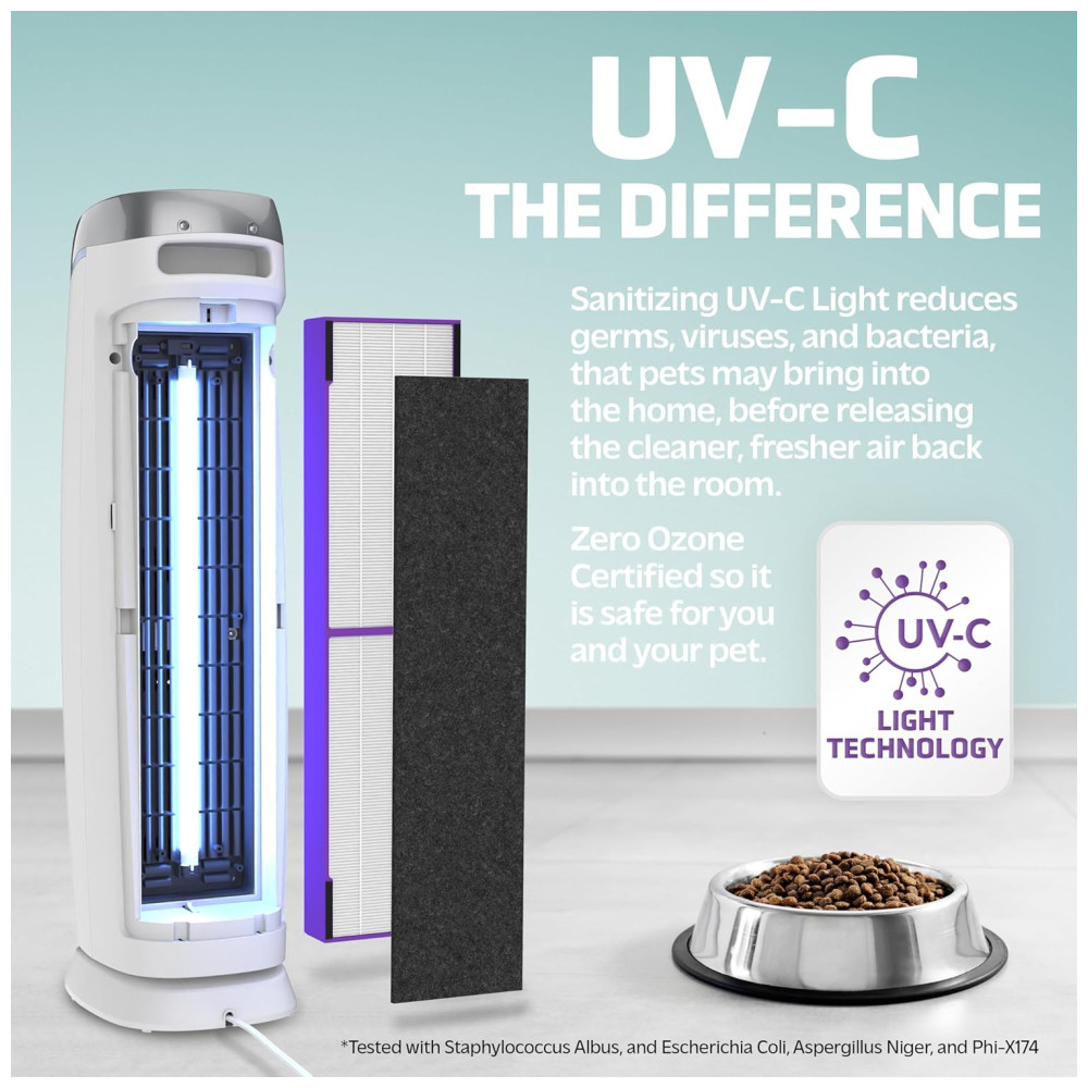 O Purificador de Ar 5 em 1 é perfeito para quem sofre de alergias. O Filtro HEPA captura 99,97% dos alérgenos, incluindo pelos de animais de estimação, ácaros e pólen. O Pet Pure é um agente antimicrobiano adicionado ao filtro para inibir o crescimento de mofo, bolor e bactérias causadoras de odores na superfície do filtro. Além de um filtro, a luz UVC ajuda a reduzir bactérias, vírus no ar, esporos de mofo e compostos orgânicos voláteis. Circula o ar 1 vez por hora em ambientes de 85m² e 4,8 vezes por hora em ambientes de 18m², tornando-o ideal para ambientes de médio a grande porte, como dormitórios, quartos e outras áreas de convívio! O painel digital de fácil utilização inclui controle UVC, indicador de troca de filtro e timer de até 8 horas. 5 velocidades oferecem controle de alérgenos de alta velocidade até o modo de sono ultra silencioso. Testado com Staphylococcus Albus, Escherichia Coli, Aspergillus Niger e PhiX174 ALTO DESEMPENHO Circula o ar 1 vez por hora em ambientes de 85m² e 4,8 vezes por hora em ambientes de 18m², tornando-o ideal para ambientes de médio a grande porte, como dormitórios, quartos e outras áreas de convívio! PURIFICADOR DE AR PARA CASA O filtro de ar True HEPA reduz até 99,97% de germes nocivos, poeira, pólen, pelos de animais de estimação, esporos de mofo e outros alérgenos tão pequenos quanto 0,1 mícron do ar COMBATE GERMES A luz UVC ajuda a reduzir vírus no ar, como gripe, estafilococos, rinovírus, e atua com dióxido de titânio para reduzir compostos orgânicos voláteis PRENDE ALÉRGENOS O pré-filtro retém poeira, pelos de animais de estimação e outras partículas grandes, enquanto estende a vida útil do filtro HEPA FILTRO PET PURE Um agente antimicrobiano é adicionado ao filtro para inibir o crescimento de mofo, bolor e bactérias causadoras de odores na superfície dos filtros CERTIFICADO ZERO DE OZÔNIO A luz ultravioleta UVC age como a última linha de defesa, ajudando a reduzir germes no ar, como Staphylococcus Albus, Escherichia Coli, Aspergillus Niger e PhiX174, além de bactérias no ar e esporos de mofo REDUZ ODORES O filtro de carvão ativado ajuda a reduzir odores indesejados de animais de estimação, fumaça, fumaça de cozinha e muito mais.
