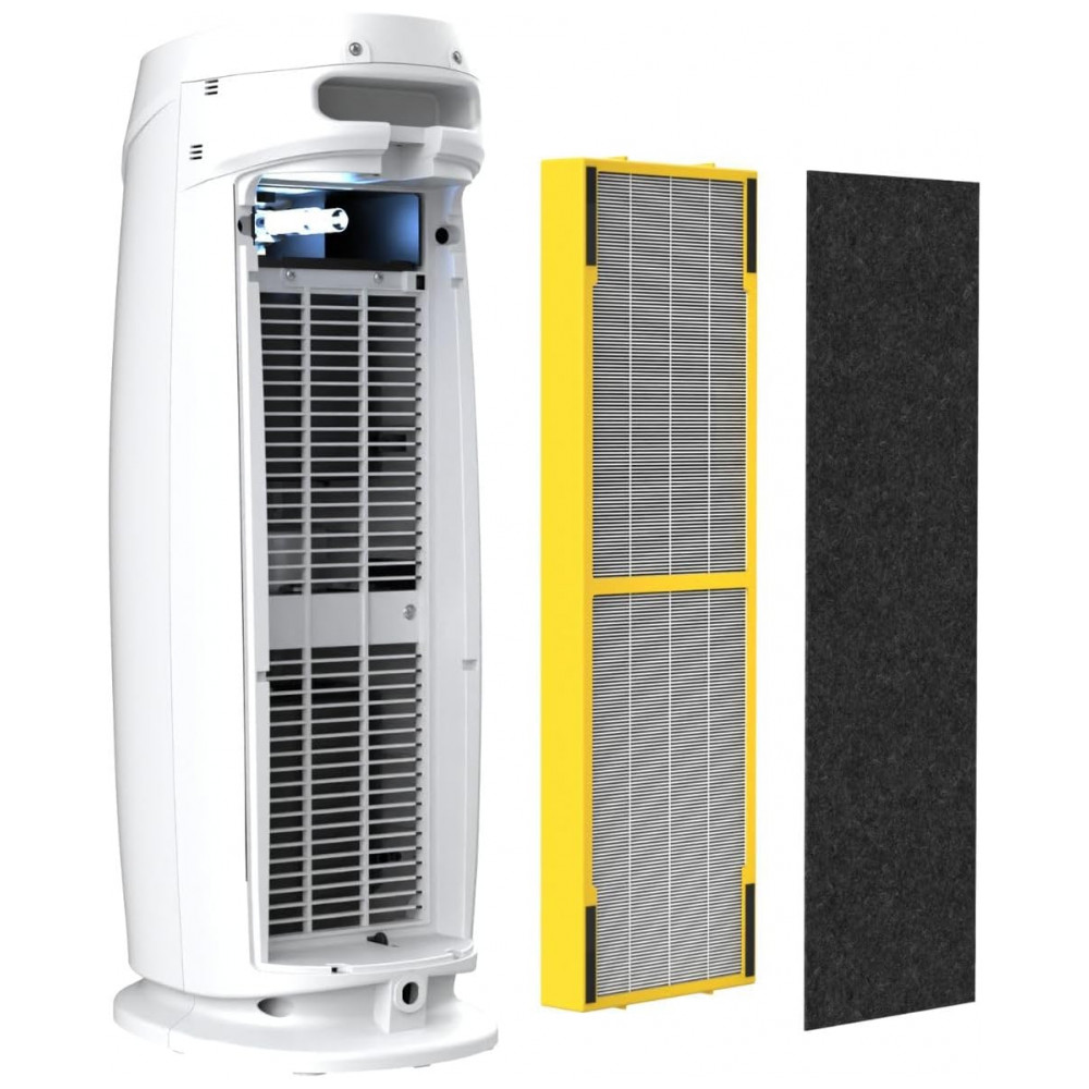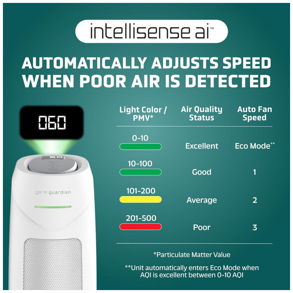 RESPIRE AR FRESCO E LIMPO! O purificador de ar GermGuardian Intelligent Tower de 22″ ajuda a reduzir germes e vírus, filtrar odores e capturar alérgenos com 3 camadas de proteção. Com filtro genuíno HEPA PURE, luz UVC opcional e pré-filtro de carvão ativado, este purificador de ar oferece ar refrescante para sua casa. Seu conforto em casa pode ser personalizado no painel de exibição de sete segmentos com modo automático, 3 configurações de velocidade e modo ultra silencioso na velocidade mais baixa. O indicador de qualidade do ar Intellisense mede a qualidade do ar 60 vezes por minuto, automaticamente ajusta a velocidade do ventilador quando o ar ruim é detectado e monitora a qualidade do ar 24 horas por dia. Circula o ar em um quarto de 14 m² a cada 12,5 minutos ou em um quarto médio a grande de 69 m² a cada hora, sendo ideal para quartos, escritórios, porões e outros espaços de conceito aberto. Seu purificador é tão poderoso e eficaz quanto o filtro que você coloca dentro dele, e nossas peças de reposição genuínas da GermGuardian são essenciais para manter o desempenho do produto. Cada filtro ou lâmpada foi projetado especificamente para uma unidade específica. As peças de reposição genuínas não só se encaixam perfeitamente, mas também possuem a tecnologia combinada necessária. Peças de Reposição: Filtro HEPA FLT4825 B, filtros especializados adicionais FLT4850PT, FLT4825VO e FLT4825SM, Filtro de Carbono FLT22CB4 e Lâmpada UVC LB4000. Este produto obteve o selo Energy Star ao atender às rigorosas diretrizes de eficiência energética estabelecidas pela EPA dos EUA. PROTEGENDO O SEU AR COM 3 CAMADAS DE PROTEÇÃO O filtro de ar Genuine HEPA PURE captura 99.97% das partículas tão pequenas quanto 0.1 mícron. Nosso filtro Genuine HEPA PURE retém poeira, pólen, germes prejudiciais e pelos de animais de estimação, certificado ZERO OZÔNIO. A luz UVC opcional age como a última linha de defesa, ajudando a reduzir germes, bactérias no ar e esporos de mofo. Nosso bulbo de vidro de quartzo de 5 watts é mais de 600% mais eficaz do que soluções de LED simples. INDICADOR DE QUALIDADE DO AR INTELLISENSE mede a qualidade do ar da sala 60 vezes por minuto usando um sensor PM 2.5, ajusta automaticamente a velocidade quando o ar ruim é detectado e volta para uma velocidade mais baixa após limpar o ar sujo. AR LIMPO EM 12,5 MINUTOS circula e filtra o ar em um quarto de 14 m² a cada 12,5 minutos ou em um quarto médio/grande de 69 m² a cada 60 minutos. REDUZ ODORES: o pré-filtro de carvão ativado retém poeira, pelos de animais de estimação e outras partículas grandes e absorve compostos orgânicos voláteis para reduzir odores de fumaça de cigarro, fumaça de incêndios florestais, cozimento e animais de estimação, prolongando a vida útil do filtro HEPA. PROJETADO E DESENVOLVIDO NOS EUA desde 2005, nossa equipe com sede em Cleveland, Ohio, estabeleceu o objetivo de mudar a indústria de purificadores de ar usando métodos de teste respeitados, realizados por laboratórios independentes que excedem os padrões da indústria. OPERAÇÃO SILENCIOSA 3 opções de modo automático com a configuração mais baixa sendo utilizada como modo de sono para uma noite de sono tranquila. PEÇAS DE REPOSIÇÃO GENUÍNAS DA GERMGUARDIAN: o filtro de reposição é FLT4825 HEPA Filter B e variantes FLT4850PT, FLT4825SM, FLT4825VO, lâmpada UVC de reposição LB1000 e filtro de carbono FLT22CB4.