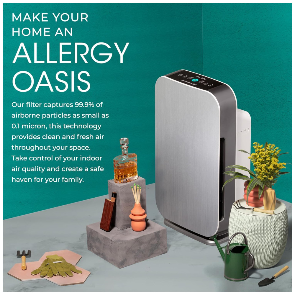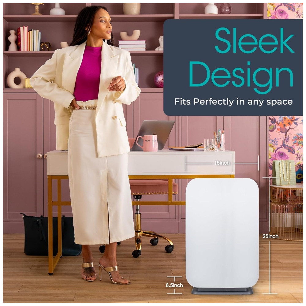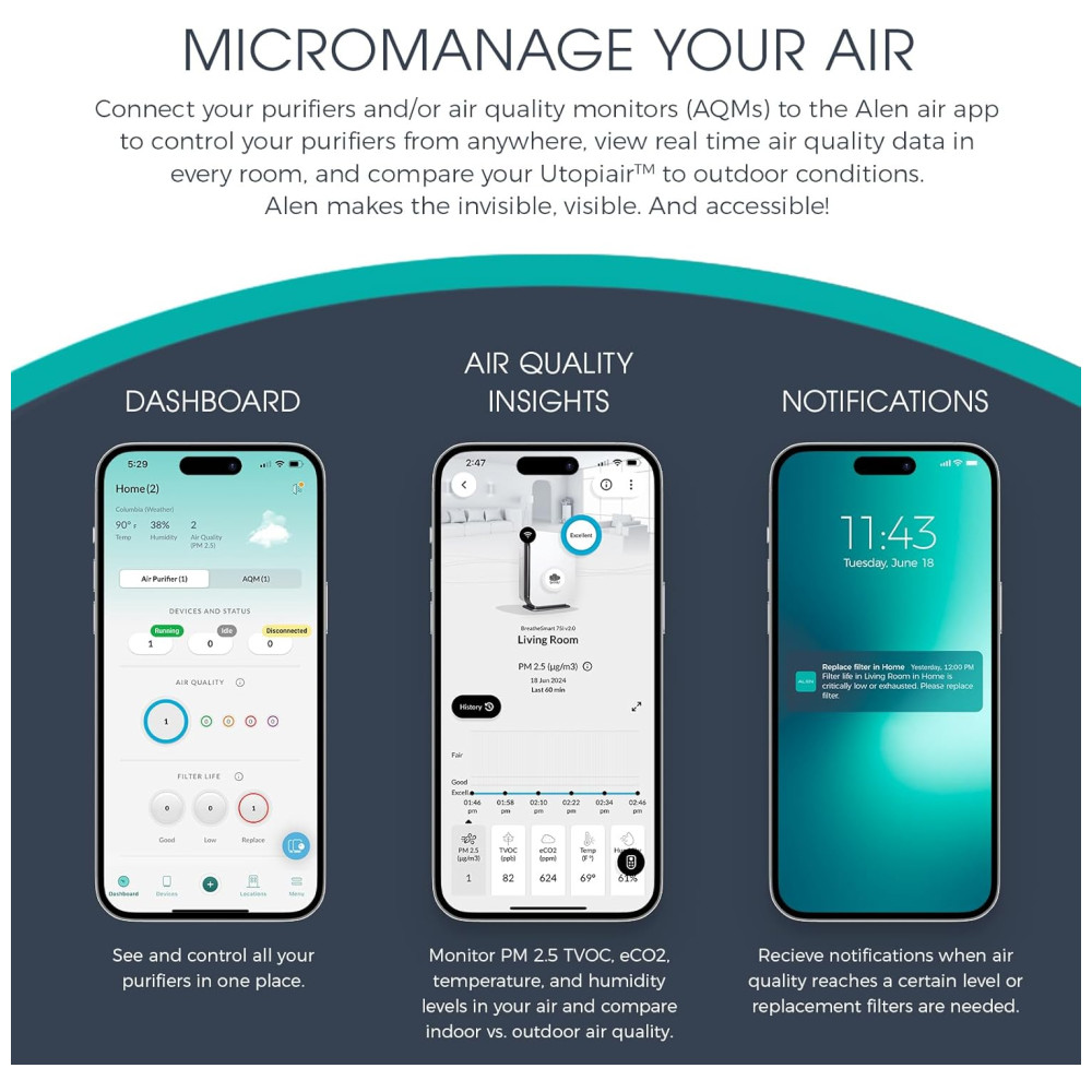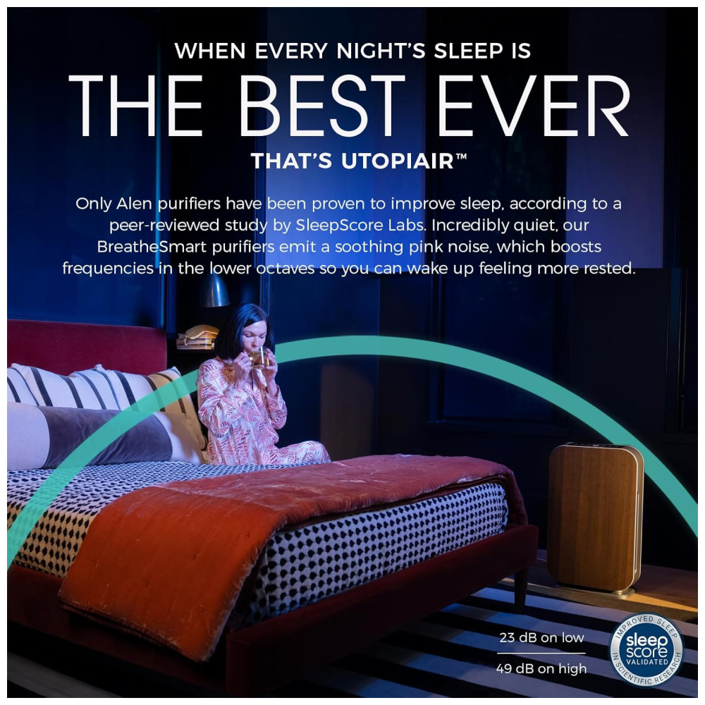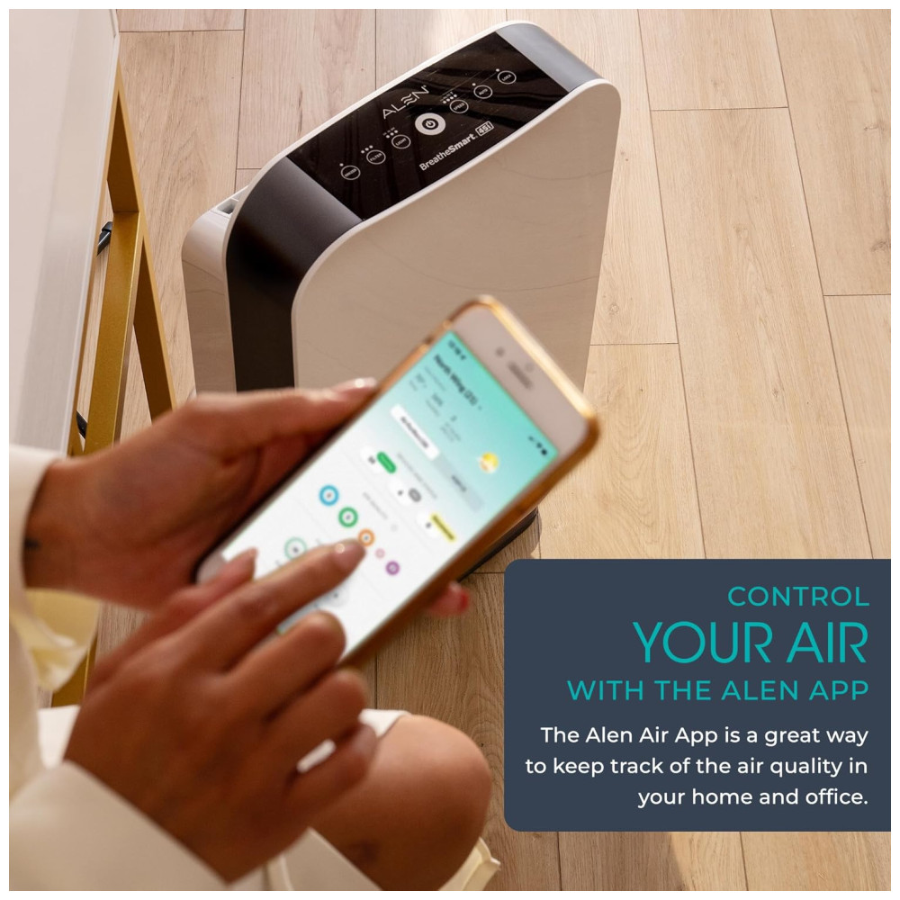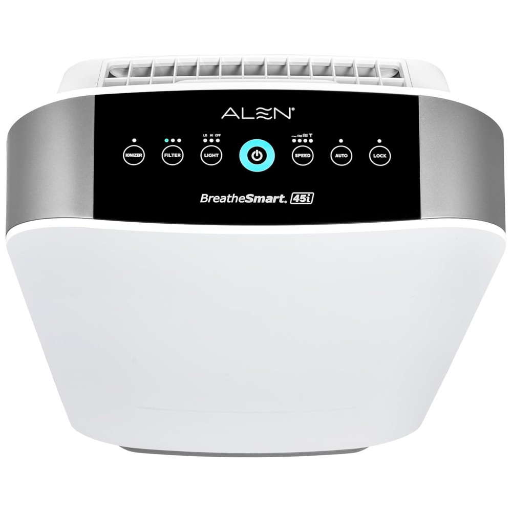 PODEROSO E SLEEK Limpa 76m a cada 30 minutos circula o ar até 5 vezes por hora Design elegante cabe em qualquer espaço de quartos pequenos a extra grandes salas de estar escritórios berçários cozinhas e porões MATA GERMAS E MOLDE Recomendado para alérgenos de poeira, odores de pele de animal de estimação MAIS bactérias e esporos de mofo O filtro Pure inclui um composto que ajuda a matar germes aerotransportados, bactérias, fungos e vírus, incluindo a gripe TRUE HEPA Inclui uma camada HEPA de alta capacidade para capturar 99 97 das partículas transportadas pelo ar até 0 3 mícrons Filtros HEPA verdadeiros duram 3 5 meses a mais do que os filtros padrão LUZ DE QUALIDADE DO AR E SENSOR O botão liga , desliga muda de cor instantaneamente conforme o sensor detecta as partículas no ar. no modo automático, o sensor ajustará a velocidade do ventilador para limpar o ar de forma mais eficaz quando um maior número de partículas estão presentes SLEEPSCORE VALIDADO Os participantes relataram melhora na qualidade do sono e se sentiram mais descansados na manhã seguinte ao uso de Alen BreatheSmart 45i. A tecnologia WhisperMax avançada cria um ambiente relaxante enquanto produz um ruído rosa que promove um sono melhor e mais profundo. DIMMER DE LUZ Desligue as luzes, reduza a iluminação em 50 ou use como uma luz noturna moderada