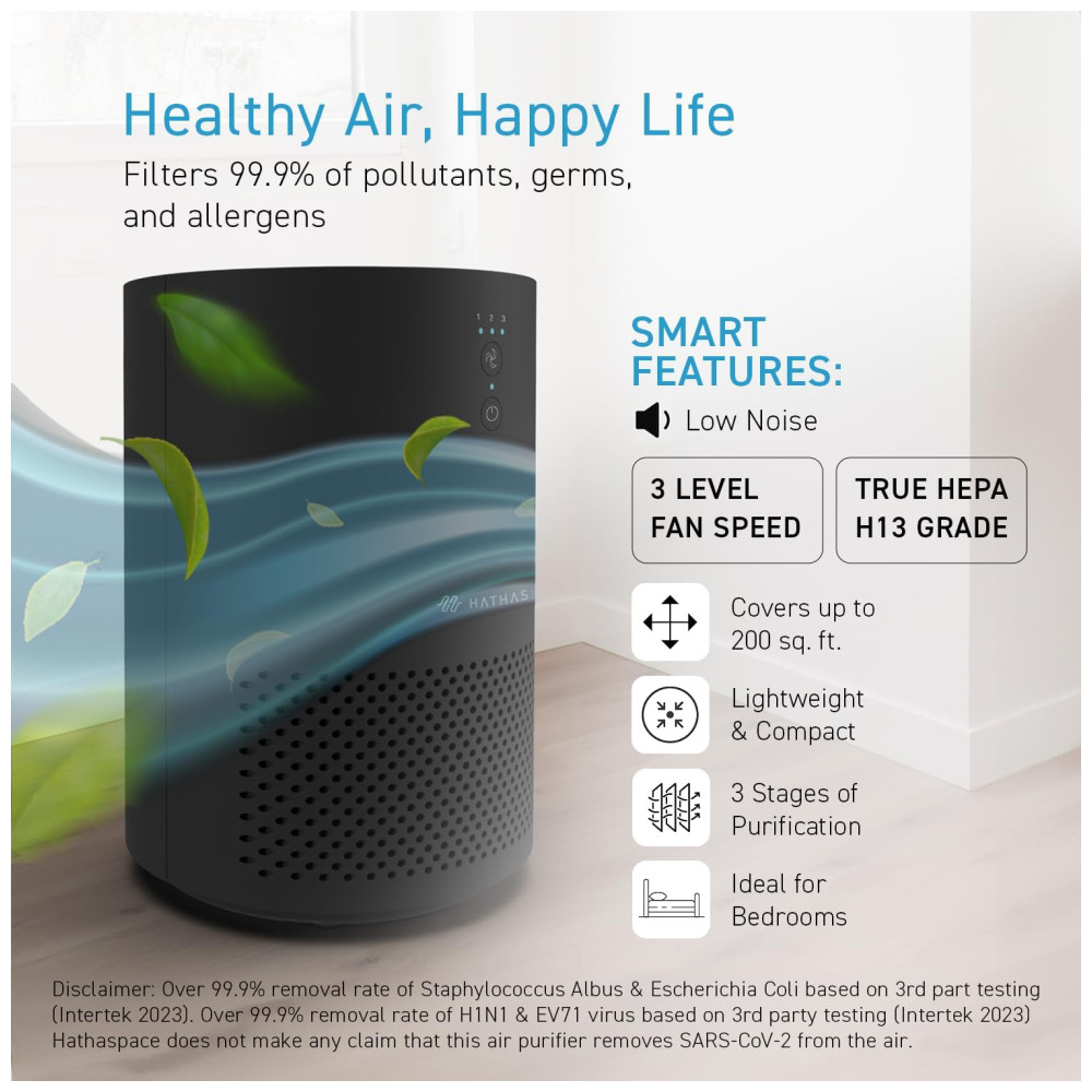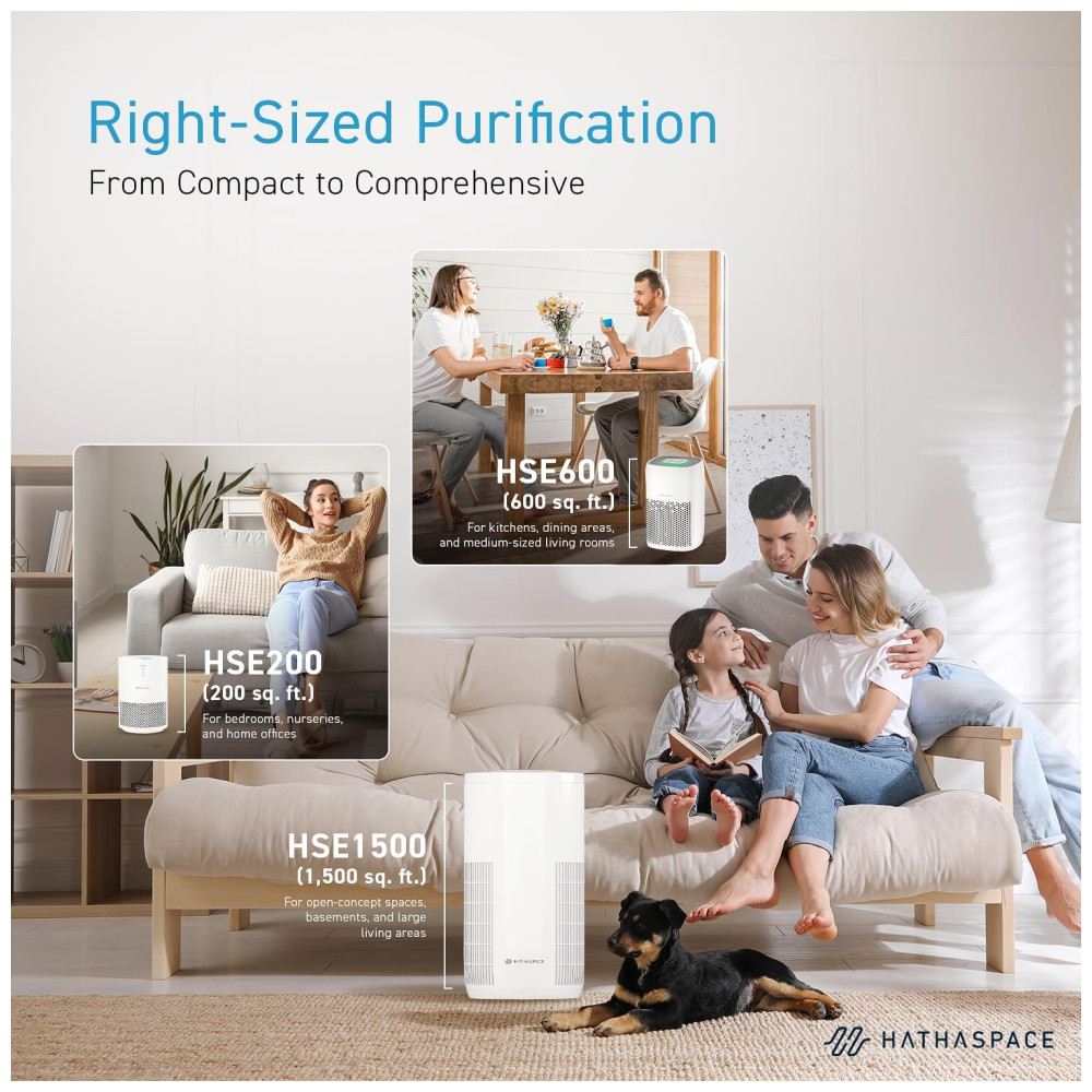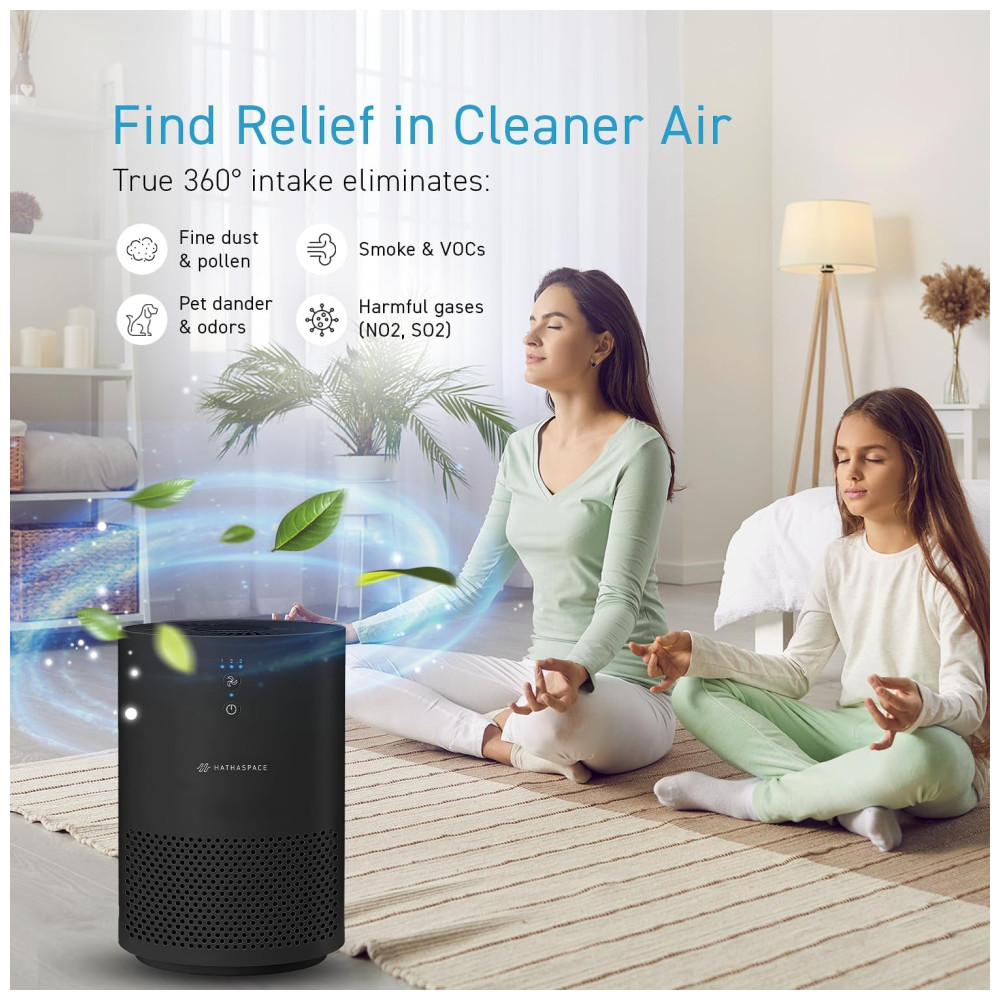 O purificador de ar HATHASPACE HSE200 é perfeito para quartos e salas, filtrando eficientemente poeira, fumaça, pelos de animais, VOCs e odores. Seu filtro H13 HEPA captura 99,9% das partículas, até 0,3 mícrons. Leve e portátil, com controle remoto elétrico de 3 velocidades, é silencioso e ideal para quartos. Fácil de usar e instalar, possui várias opções de velocidade e modo automático. Além de remover odores, fumaça e VOCs, seu design em preto é um presente pensativo para qualquer ocasião.