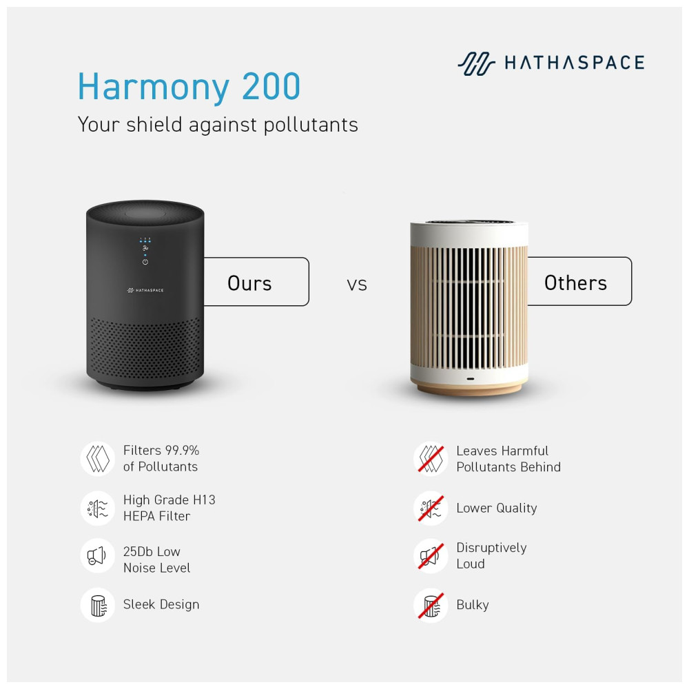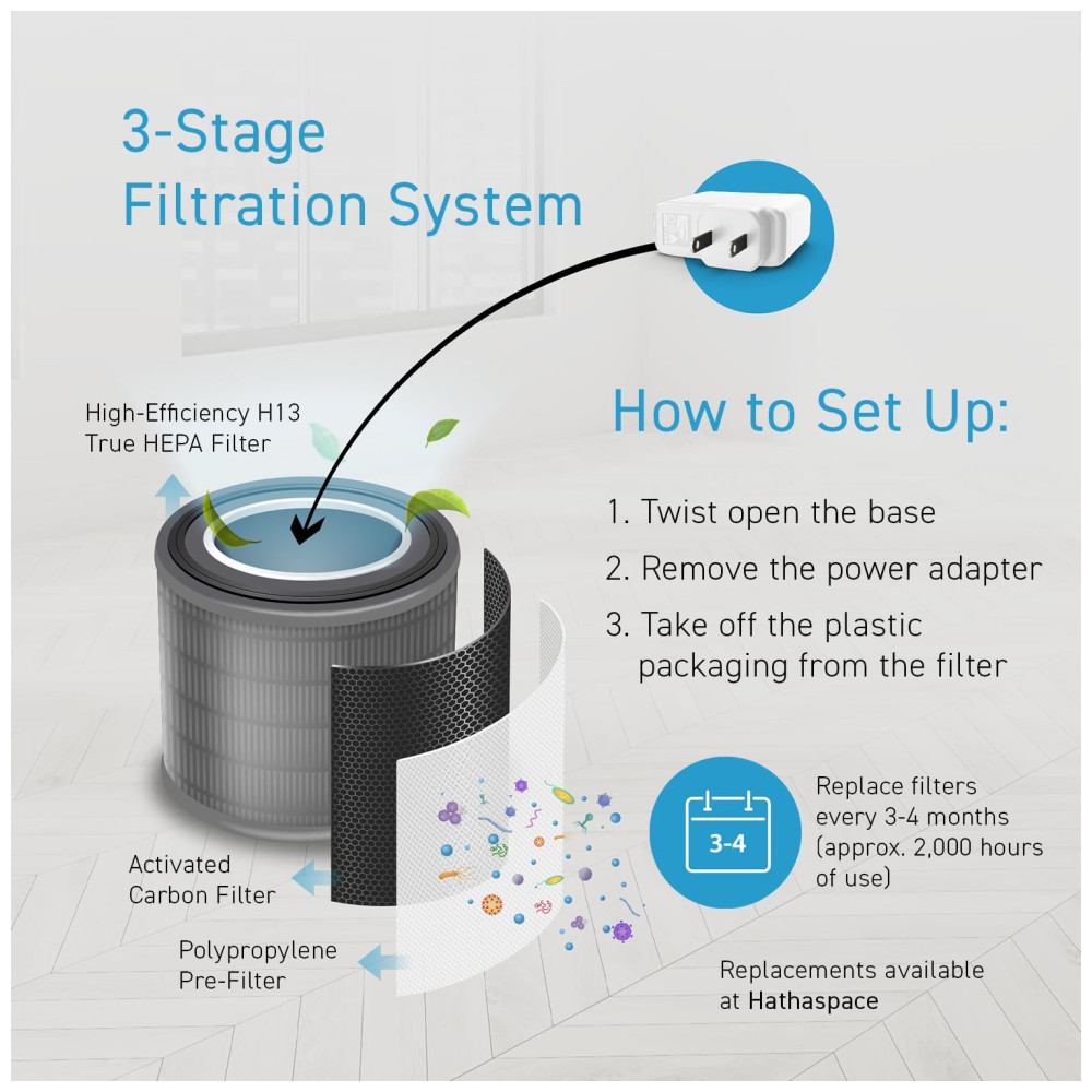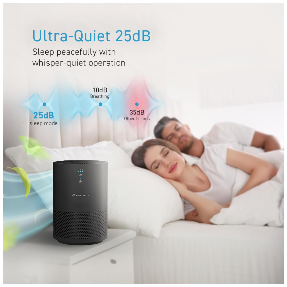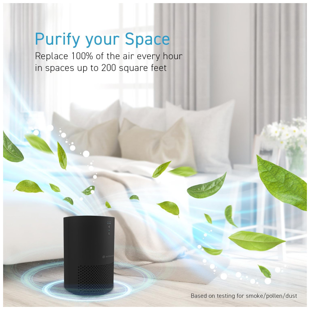 O purificador de ar HATHASPACE HSE200 é perfeito para quartos e salas, filtrando eficientemente poeira, fumaça, pelos de animais, VOCs e odores. Seu filtro H13 HEPA captura 99,9% das partículas, até 0,3 mícrons. Leve e portátil, com controle remoto elétrico de 3 velocidades, é silencioso e ideal para quartos. Fácil de usar e instalar, possui várias opções de velocidade e modo automático. Além de remover odores, fumaça e VOCs, seu design em preto é um presente pensativo para qualquer ocasião.