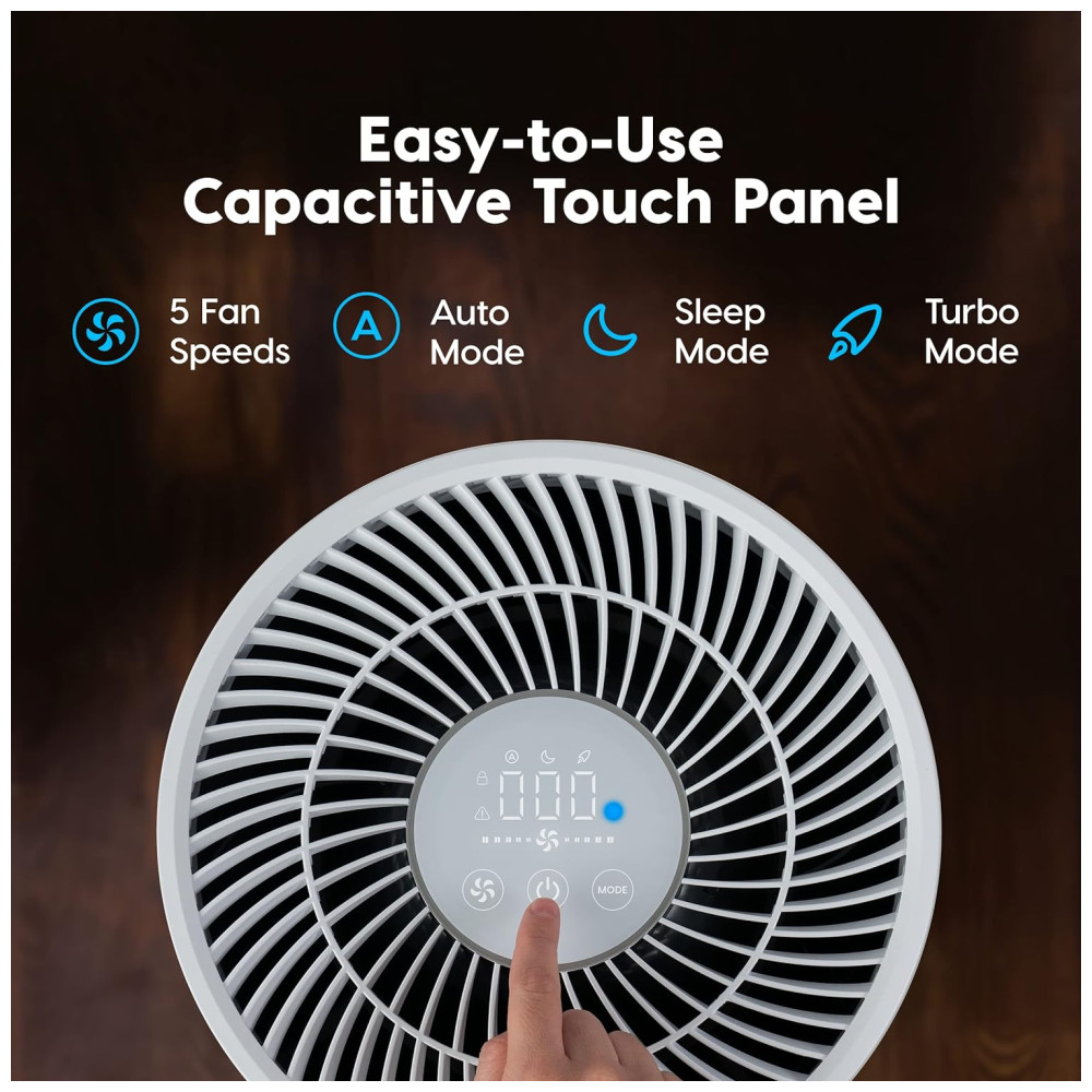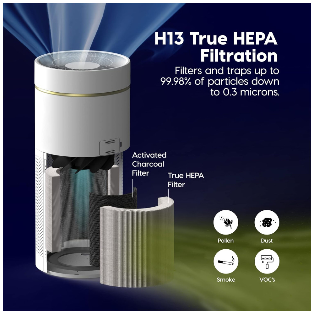 O filtro H13 True HEPA captura até 99,97% das partículas, como poeira doméstica, pólen e outros poluentes de 0,3 microns ou maiores, em um raio de 360°, enquanto o filtro de carvão ativado ajuda a reduzir odores desagradáveis de animais de estimação, odores domésticos e fumaça de cozinha e incêndios florestais.