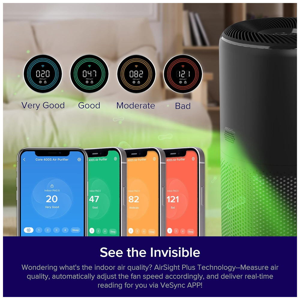Purificador de Ar LEVOIT Core 400SP para Ambientes Grandes de até 183 m² em 1 Hora – Monitor de Qualidade do Ar Modo de Sono HEPA Modo Inteligente