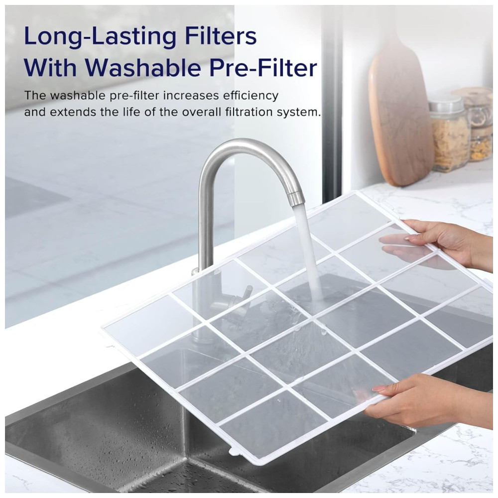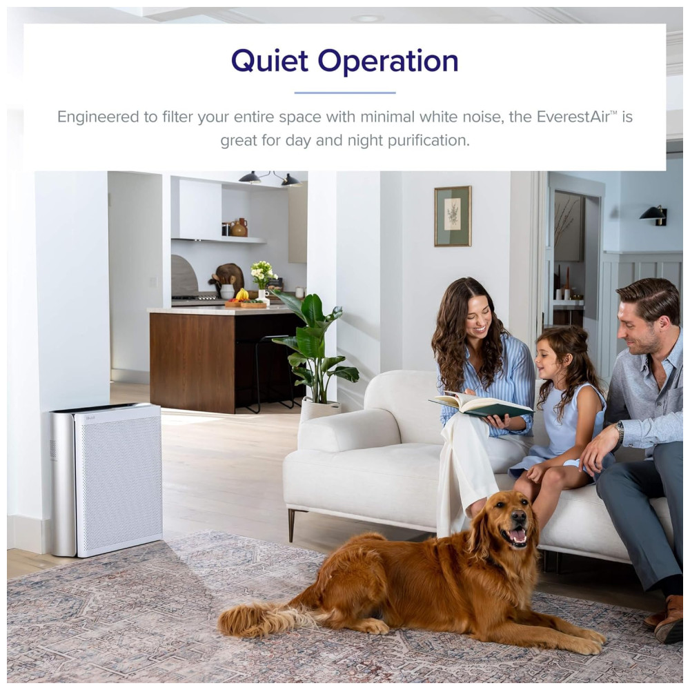 O EverestAir é um sistema de circulação de ar com um design exclusivo de duto de ventilação e um grande ventilador, que purifica rapidamente o ar em salas maiores. Com ângulos de ventilação ajustáveis, ele pode trazer ar fresco para qualquer espaço interno. Com uma poderosa taxa de fornecimento de ar limpo de 360 CFM, o EverestAir pode filtrar completamente 169,6 metros quadrados 5 vezes por hora e 848,02 metros quadrados 1 vez por hora com a filtragem EverestAir ANTIALLERGENS ODORS Premium de 3 estágios. O sistema inclui um pré filtro lavável, filtro intermediário eficiente e filtro de carbono de ativação eficiente. O EverestAir também possui um sensor de luz silencioso com níveis de ruído tão baixos quanto 24,0 DB e um sensor de poeira a laser de três canais que detecta tamanhos de partículas PM1, PM2.5 e PM10 e atualiza a tela com leituras de qualidade do ar em tempo real. Com o aplicativo VeSync gratuito, você pode controlar as configurações do EverestAir de qualquer lugar, criar programações, visualizar a qualidade do ar em tempo real e conectar se a assistentes de voz de terceiros. O EverestAir vem com um pré filtro lavável, tornando a manutenção mais econômica e minimizando o impacto ambiental. O design do EverestAir é inspirado no Monte Everest e equilibra funcionalidade prática com estética elegante. Use apenas peças de reposição genuínas Levoit para manter o melhor desempenho.