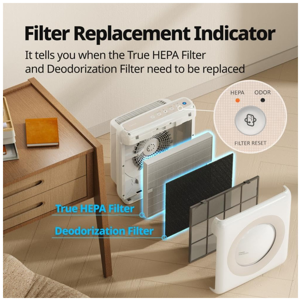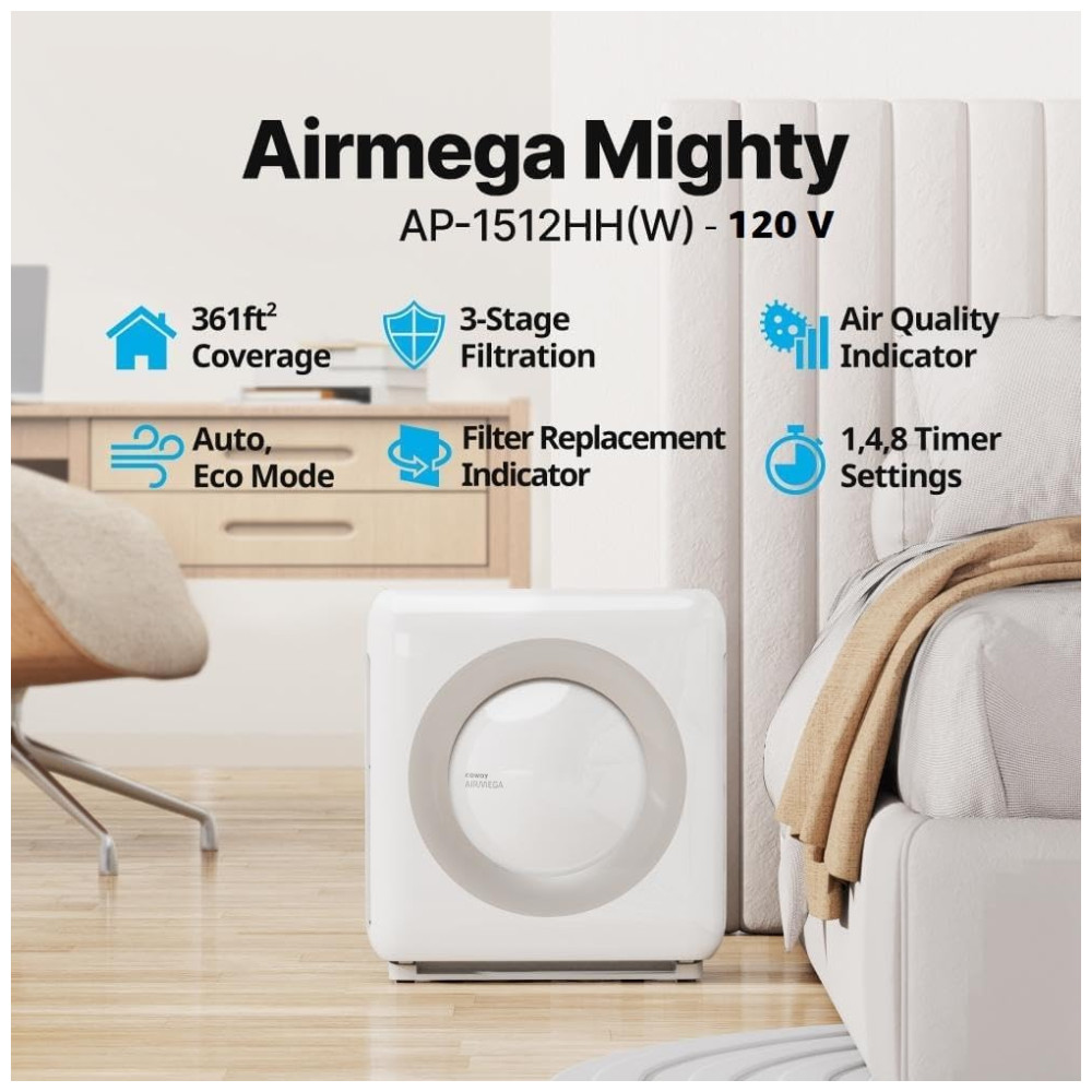Coway Mighty AP 1512HH foi projetado para acomodar tamanhos de salas de até 361 pés2 CADR Poeira 246 , Pólen 240 , Fumaça 233 cb. Pés. Sistema de filtragem de 4 estágios pré filtro, filtro de desodorização, filtro True HEPA, Vital Ion captura e reduz até 99,97 das partículas de 0,3 mícrons no ar, incluindo pólen, poluentes e outros alérgenos. Ele também reduz os compostos orgânicos voláteis e reduz o odor. O sensor de poluição Coway Mighty comunica a qualidade do ar interno em tempo real. O LED de cores vivas permite que você saiba se o ar interno está limpo ou sujo a cada minuto do dia. E possui um temporizador e indicador de vida útil do filtro. Velocidades do ventilador disponíveis em 1, 2, 3 estágios por configuração manual. Enquanto o modo automático otimiza automaticamente a configuração de velocidade de 1 a 3 com base no nível de qualidade do ar interno. Quando nenhuma poluição for detectada por 30 minutos, o ventilador irá parar automaticamente e definir o modo Eco para economizar energia. O recurso de temporizador permite que a máquina funcione 1, 4, 8 horas antes de desligar automaticamente. O indicador de substituição do filtro verifica o pré filtro e o filtro HEPA, respectivamente, para permitir que os usuários estejam cientes de quando lavar ou substituir o filtro. Consumo de energia de 77 W e operação silenciosa com nível de ruído variando de 24,4 dB a 53,8 dB. A garantia limitada do fabricante cobre todas as peças internas , funcionais por 1 ano e as peças do motor e eletrônicas por 3 anos. Filtros são excluídos. Ganhou o Melhor Purificador de Ar de 2018 no Wirecutter e ficou em 1 lugar no TopTenReviews.