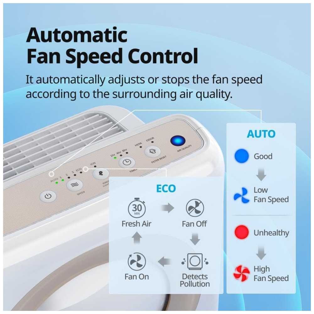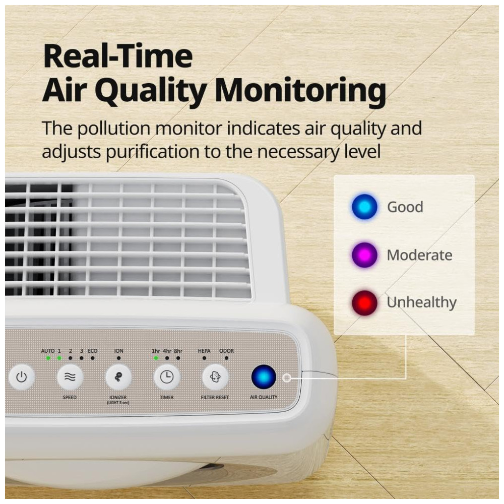 Cor Branco Nome do estilo Purificador O poderoso purificador de ar está equipado com recursos de ponta para manter o ar interno limpo. Equipado com uma classificação de eficiência HEPA de 99,97, ele usa um sistema de filtragem de quatro estágios para eliminar odores e poluentes com eficácia. Esta máquina poderosa inclui um indicador de qualidade do ar por meio de nossa tecnologia de detecção de partículas que colocará seu purificador de ar em alta velocidade quando necessário. E quando a poluição não é detectada por 30 minutos, o ventilador irá parar automaticamente para economizar energia. CFM 268,39