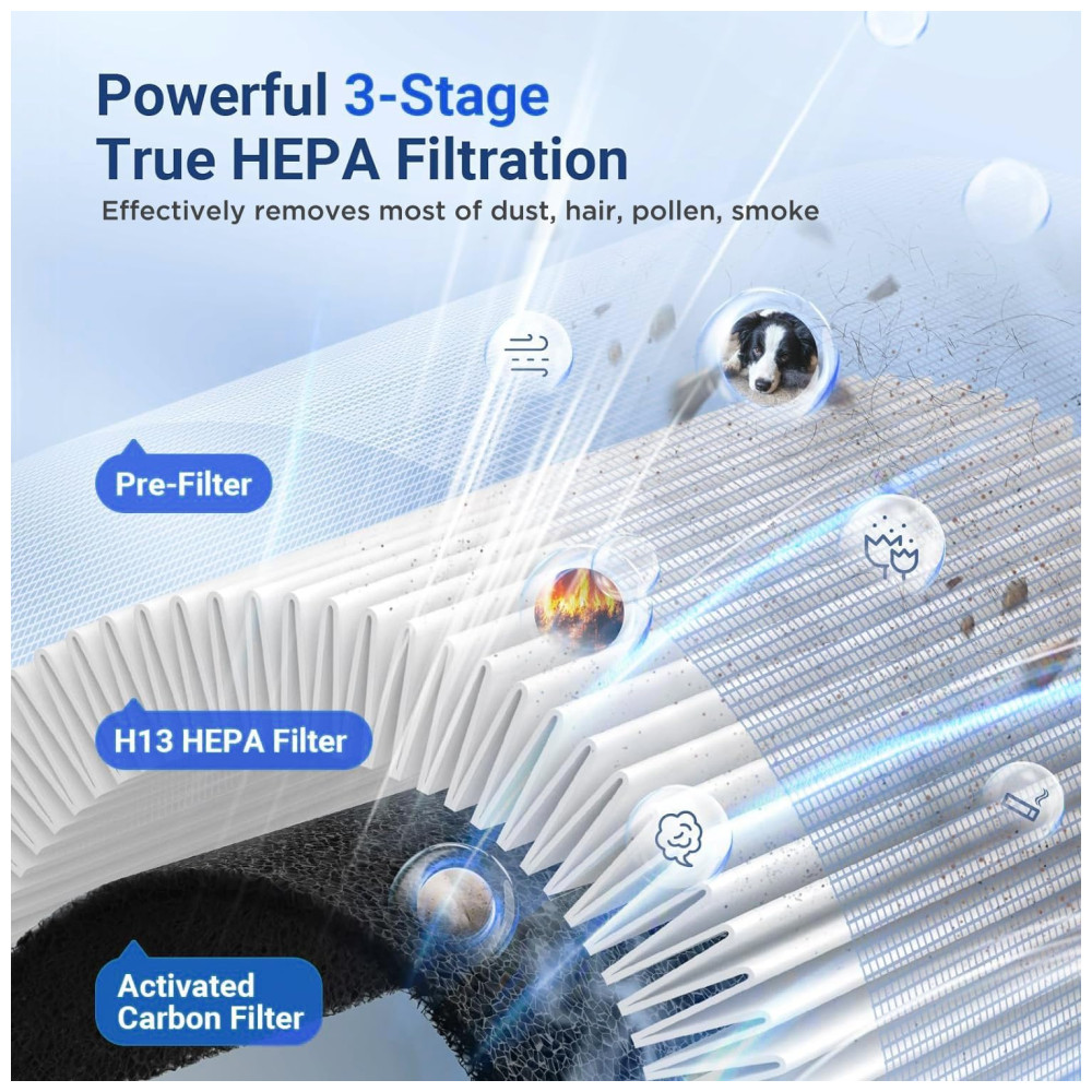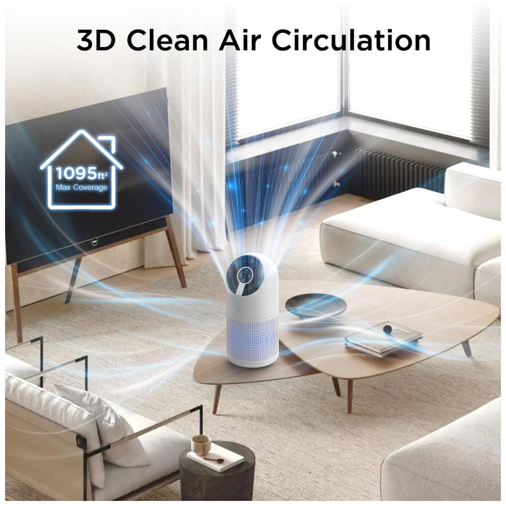 Este purificador de ar doméstico é potente e eficiente, utilizando um sistema de filtragem de 4 estágios para capturar poluentes do ar, como pólen, pelos de animais de estimação, caspa, fumaça, odores e grandes partículas de poeira. Com um design elegante, ele se adapta a qualquer ambiente, desde salas pequenas a grandes, quartos, escritórios, berçários, cozinhas e porões. Com uma área de cobertura de até 100m², é ideal para donos de animais de estimação, bebês, crianças, idosos ou qualquer pessoa que deseja melhorar a qualidade do ar.