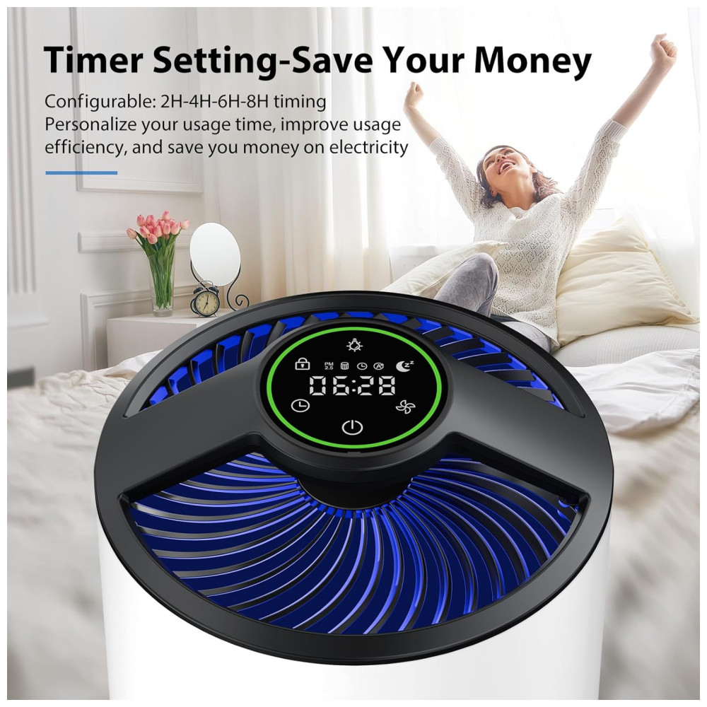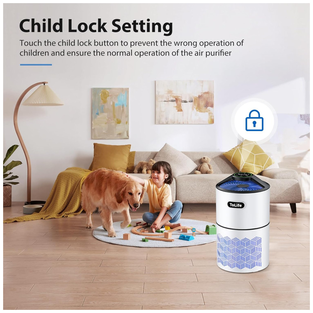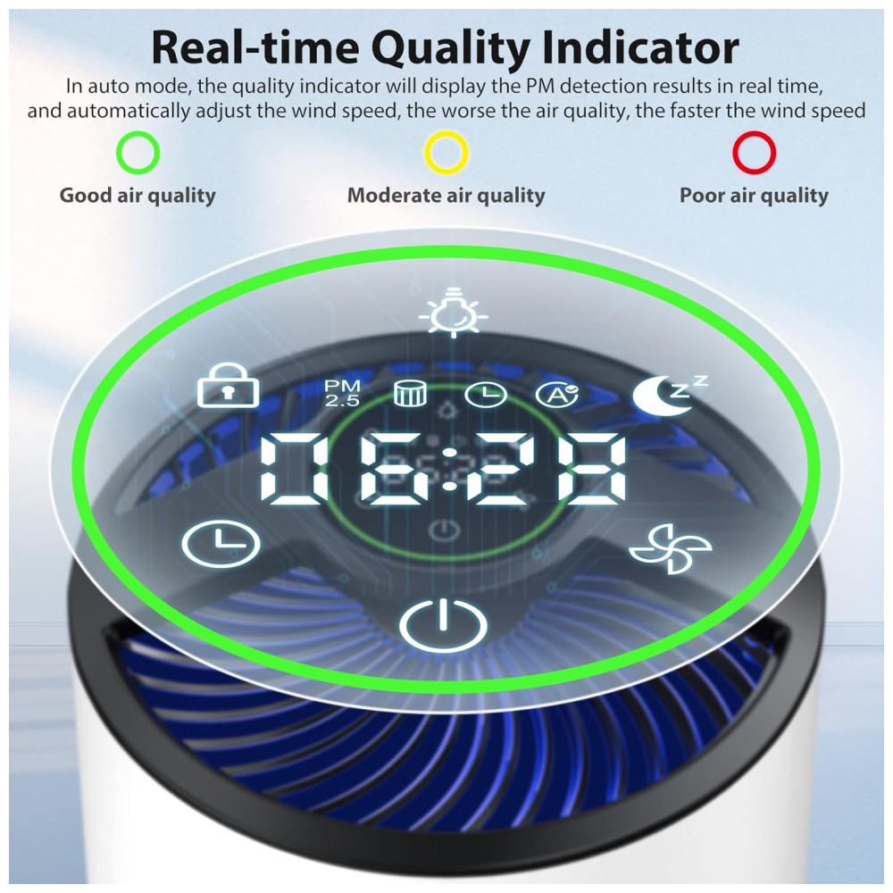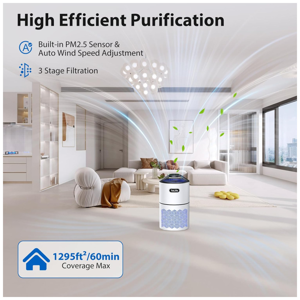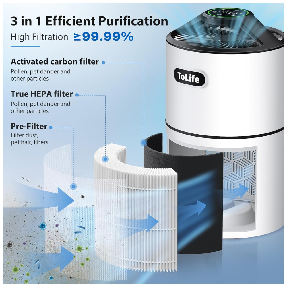 Este purificador de ar é altamente eficiente, equipado com um sistema de filtragem HEPA 3 em 1 que captura 99,97% das partículas no ar, incluindo poeira, pelos de animais e pólen. Ele também possui um filtro de carvão ativado, que remove fumaça, odores de animais de estimação e compostos orgânicos voláteis (VOCs).