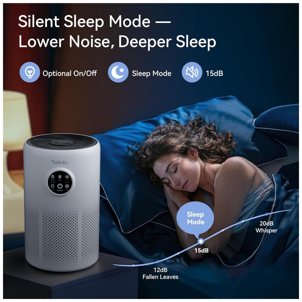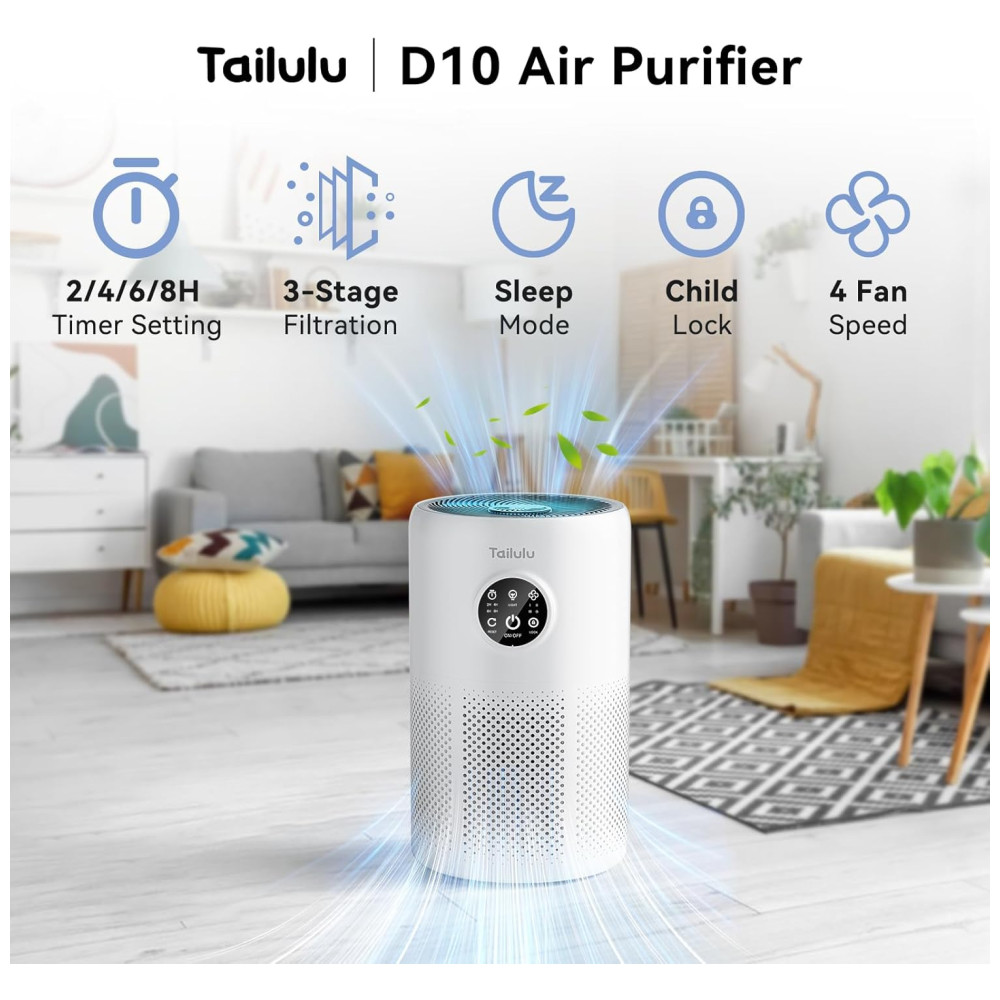 Ideal para salas pequenas e grandes, quartos, escritórios, cozinhas e porões, o Tailulu D10 possui um painel de toque inteligente que facilita seu uso. Com 4 velocidades de ventilador, modo de espera, temporizador e luz noturna opcional, o purificador também conta com uma esponja de aromaterapia, permitindo adicionar fragrâncias ao ambiente.