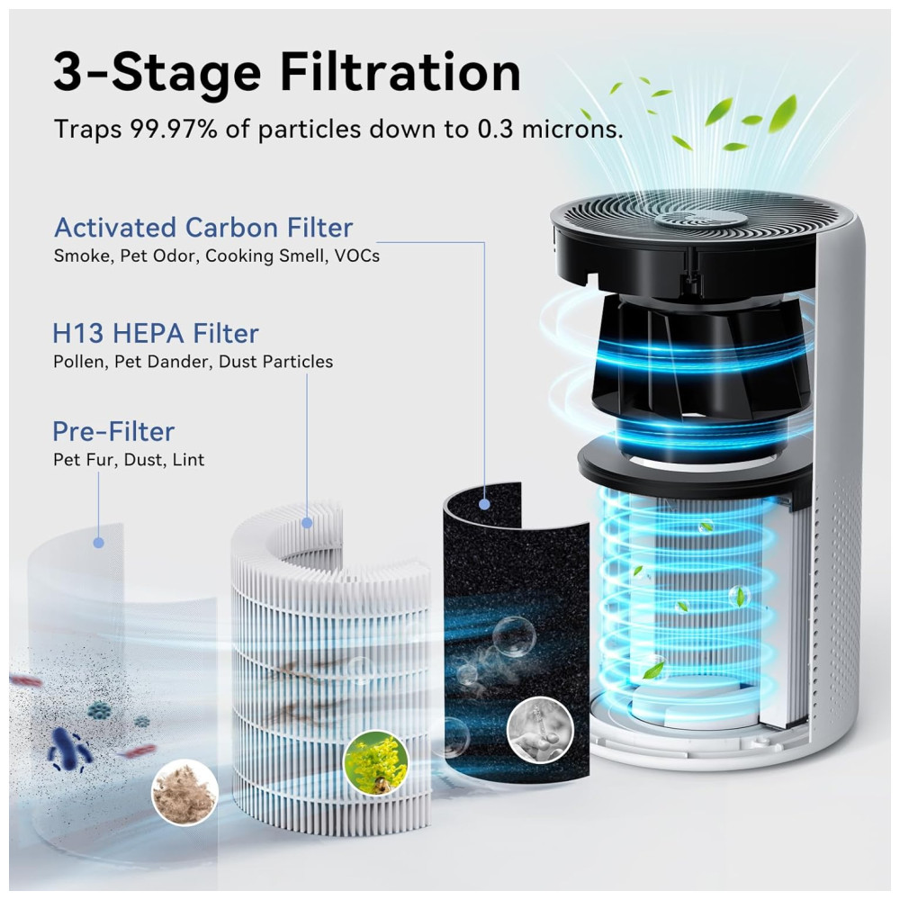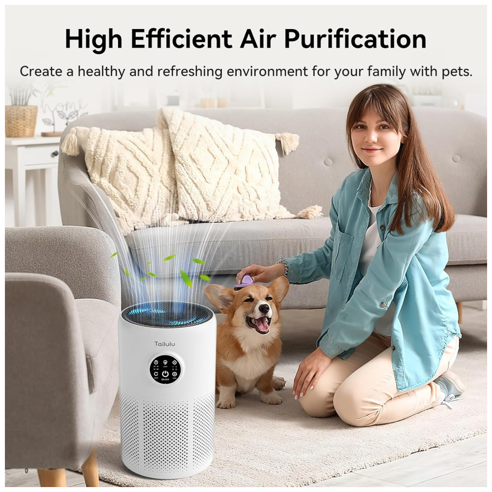 O purificador de ar Tailulu D10 é uma solução altamente eficiente para quem deseja melhorar a qualidade do ar interno. Com um sistema de filtragem de 3 estágios – incluindo pré-filtro, filtro HEPA verdadeiro H13 e filtro de carvão ativado – ele é capaz de eliminar diversos poluentes, como pelos de animais, fumaça, odores de cozinha, poeira, pólen e compostos orgânicos voláteis (COVs). As entradas de ar em 360 graus garantem uma filtragem poderosa e uniforme.