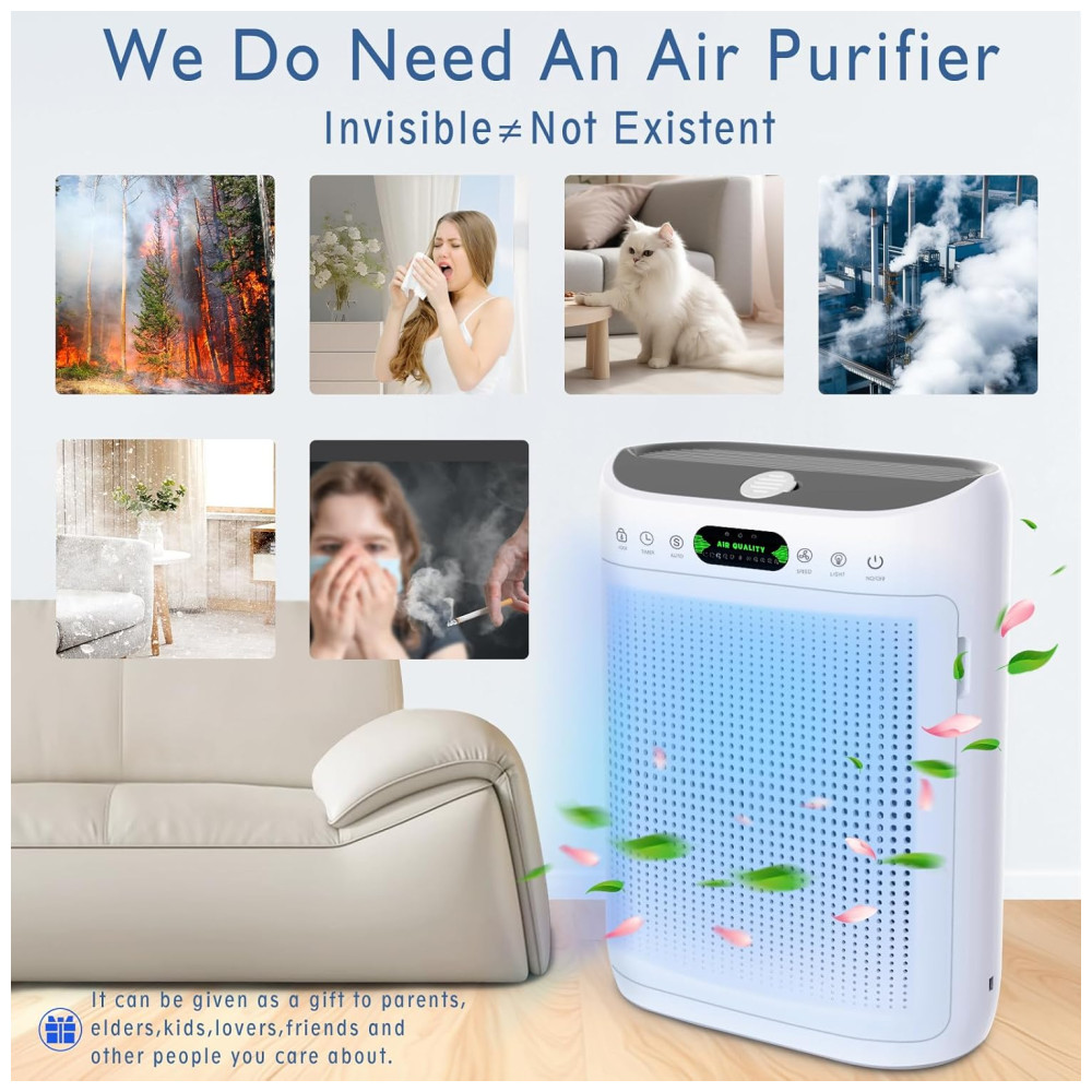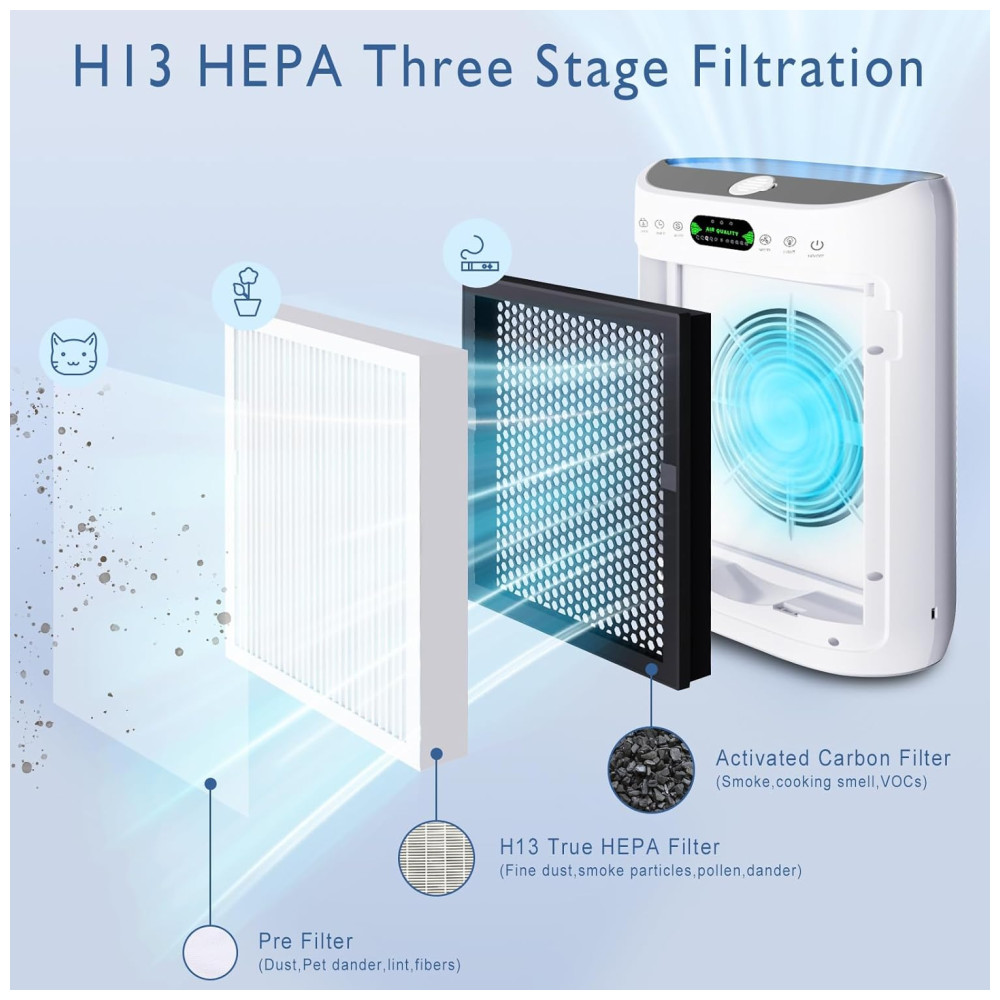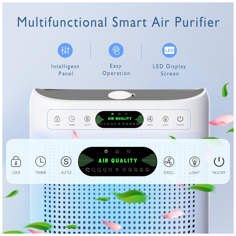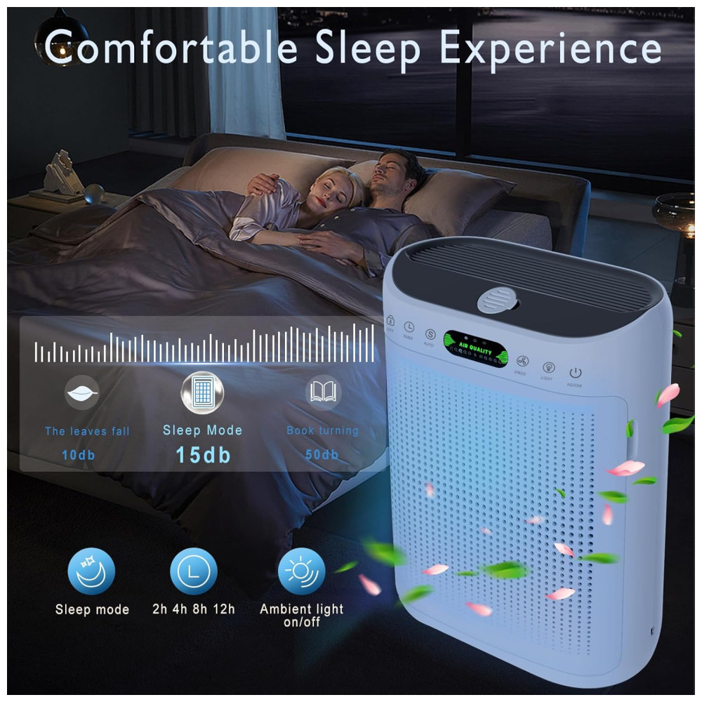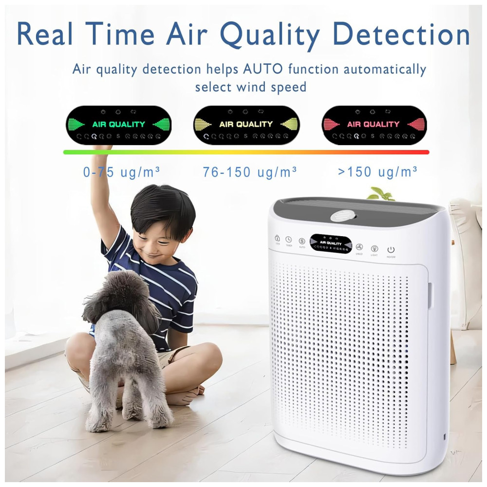 Ele possui 6 modos de ventilador, luz noturna e uma função de temporizador com 5 configurações. Equipado com um sensor de qualidade do ar, o purificador exibe os níveis de PM2.5 em tempo real na tela de exibição, permitindo que você monitore a qualidade do ar com facilidade.