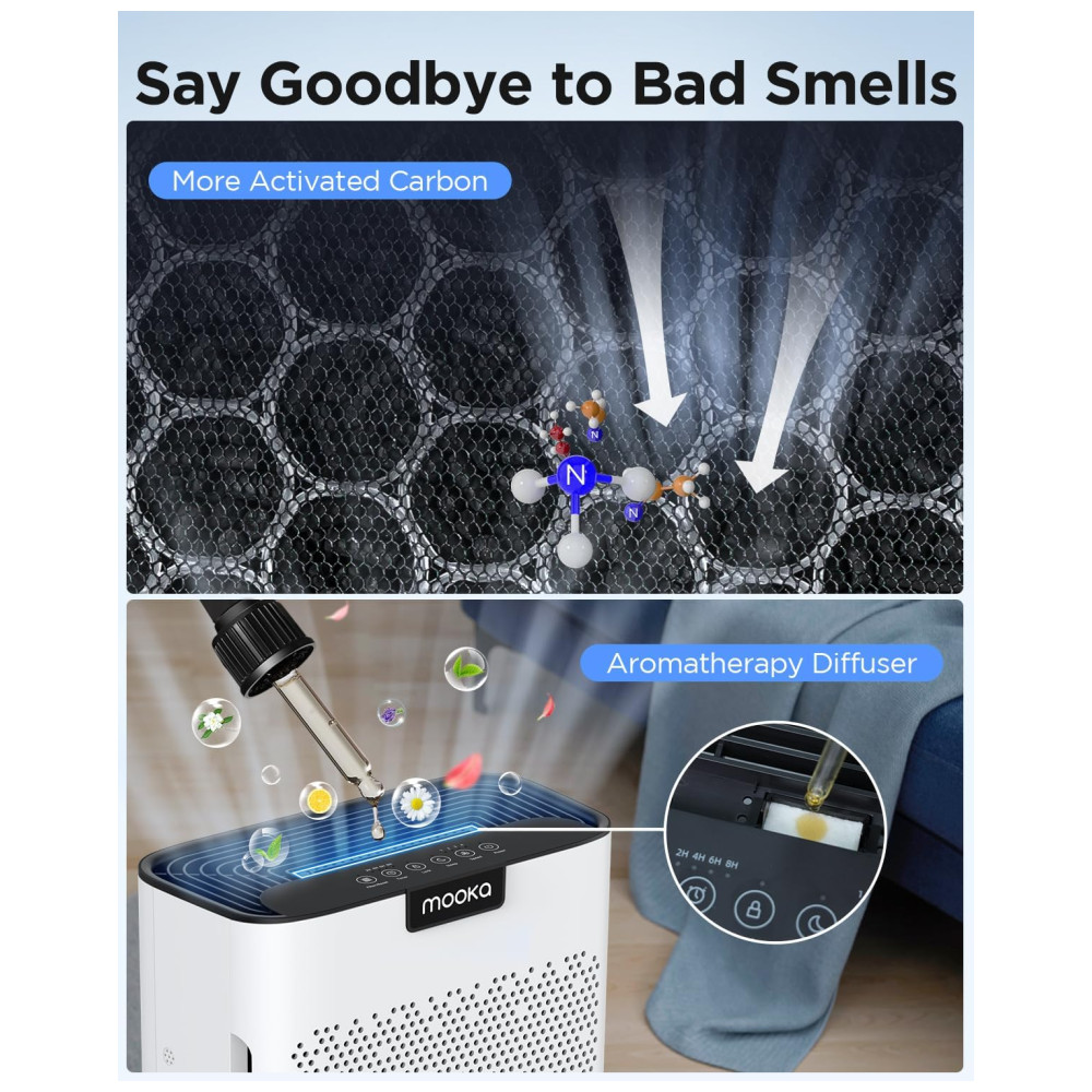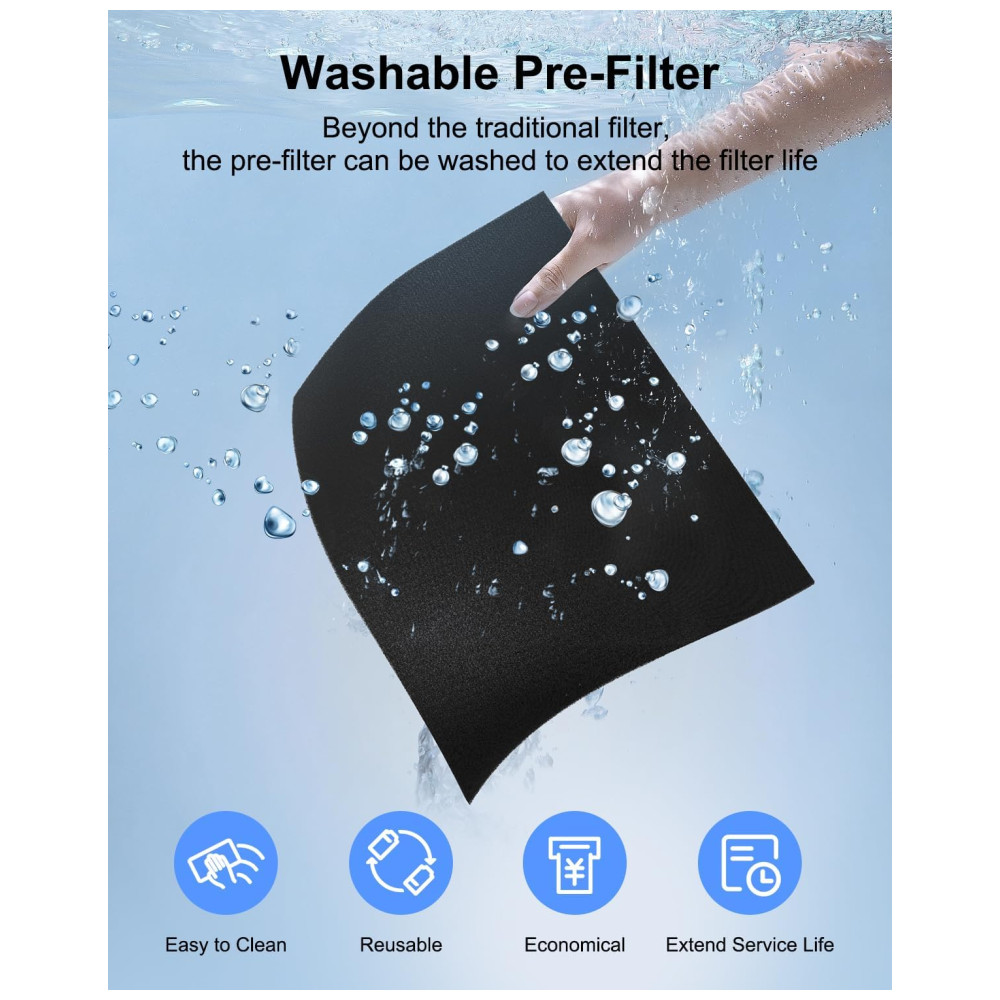 O pré-filtro pode ser facilmente limpo com água ou aspirador de pó, prolongando a vida útil do filtro HEPA H13. Além disso, conta com mais pellets de carvão ativado, que ajudam a absorver odores desagradáveis, como os de animais de estimação, fumaça e compostos orgânicos voláteis (VOCs).