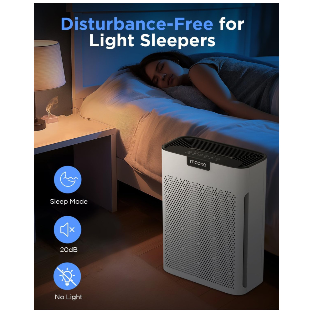 O purificador oferece 4 velocidades de ventilador ajustáveis e 4 opções de temporizador, permitindo programar o funcionamento para 2, 4, 6 ou 8 horas. O modo de sono silencioso opera com um nível de ruído tão baixo quanto 20,0 dB, tornando-o ideal para pessoas com sono leve, bebês ou animais de estimação.
