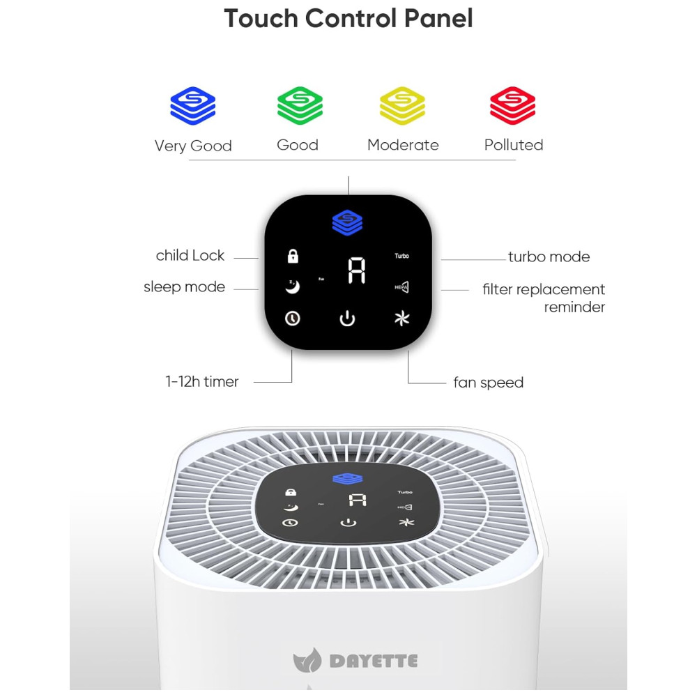 O purificador possui um sensor PM2.5 integrado que indica a qualidade do ar por meio de uma luz codificada por cores: azul para muito bom, verde para bom, amarelo para moderado e vermelho para poluído. Ele ajusta automaticamente a velocidade do ventilador no modo automático, respondendo às mudanças na qualidade do ar.