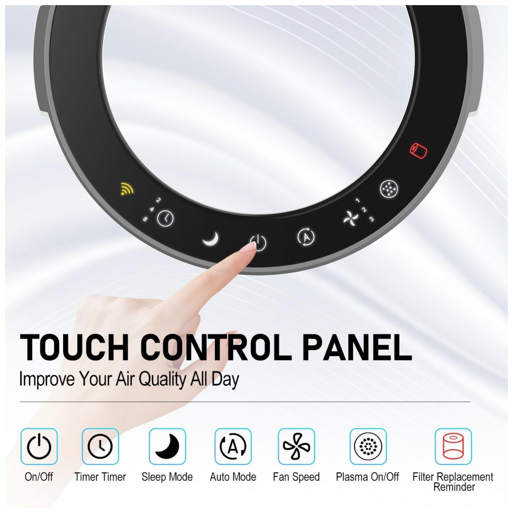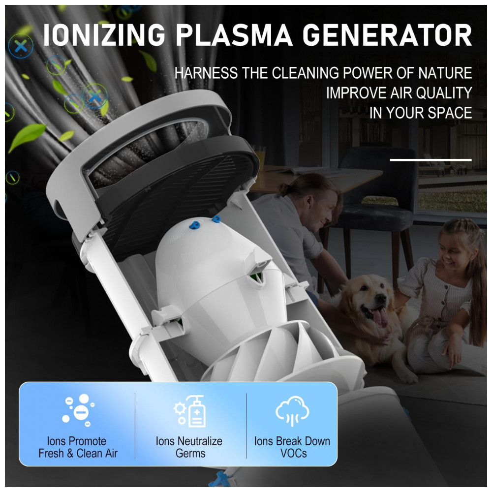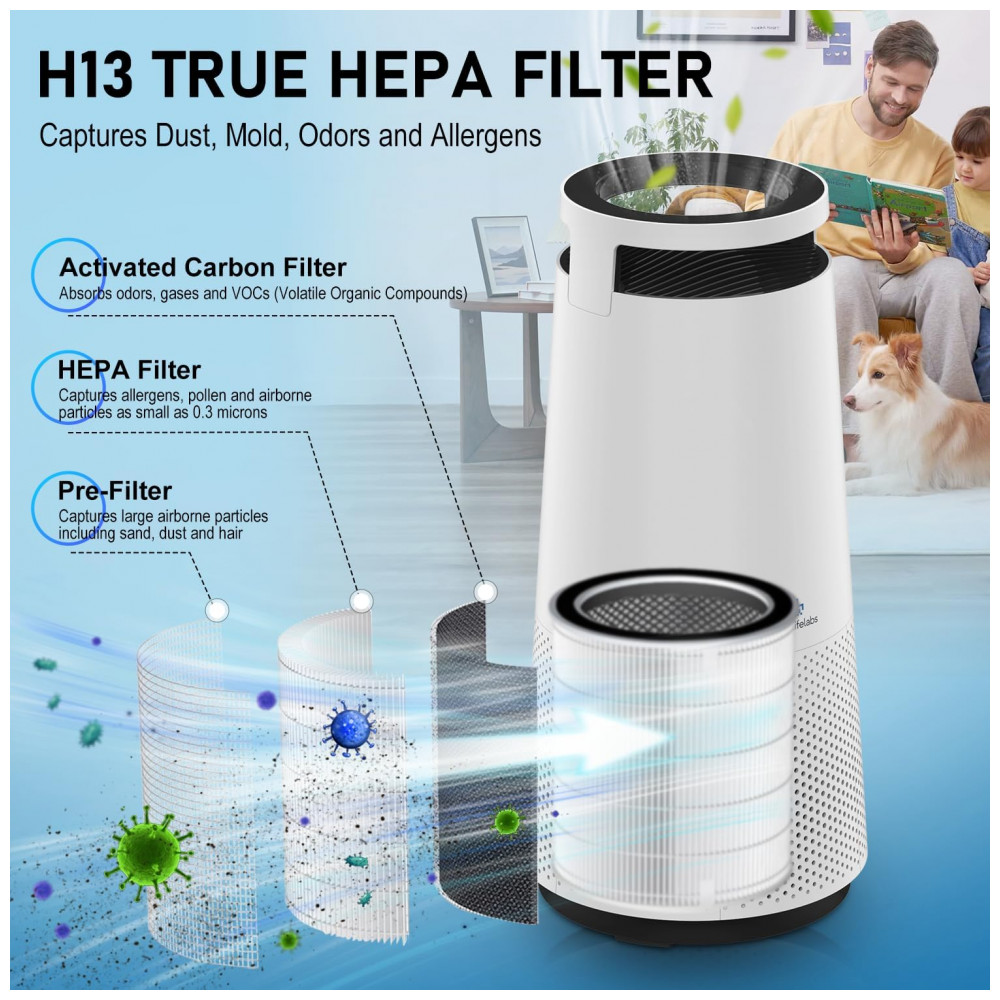 Composto por três estágios – pré-filtro, filtro HEPA e filtro de carvão ativado – ele remove 99,97% das partículas tão pequenas quanto 0,3 mícrons, como pólen, poeira, fumaça, pelos de animais, mofo, odores e compostos orgânicos voláteis (VOCs).