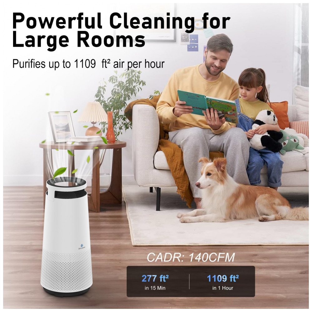 O filtro de carvão ativado neutraliza odores indesejados, como amônia e formaldeído. Com cobertura de 70,21 metros quadrados, este purificador é perfeito para casa, quartos, escritórios e berçários. Mantenha o ar fresco e livre de germes e poluentes ao longo do dia!