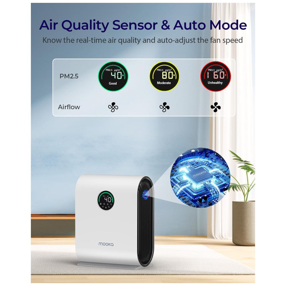 O purificador de ar MOOKA KJ217 é um equipamento de alta qualidade que conta com um sensor inteligente PM2.5, monitorando a qualidade do ar em tempo real e exibindo as informações na tela. Com cinco modos automáticos, ele ajusta a velocidade do ventilador conforme a qualidade do ar, proporcionando um ambiente saudável e relaxante em diferentes espaços, como quartos, salas de estar, escritórios, berçários, porões e cozinhas.