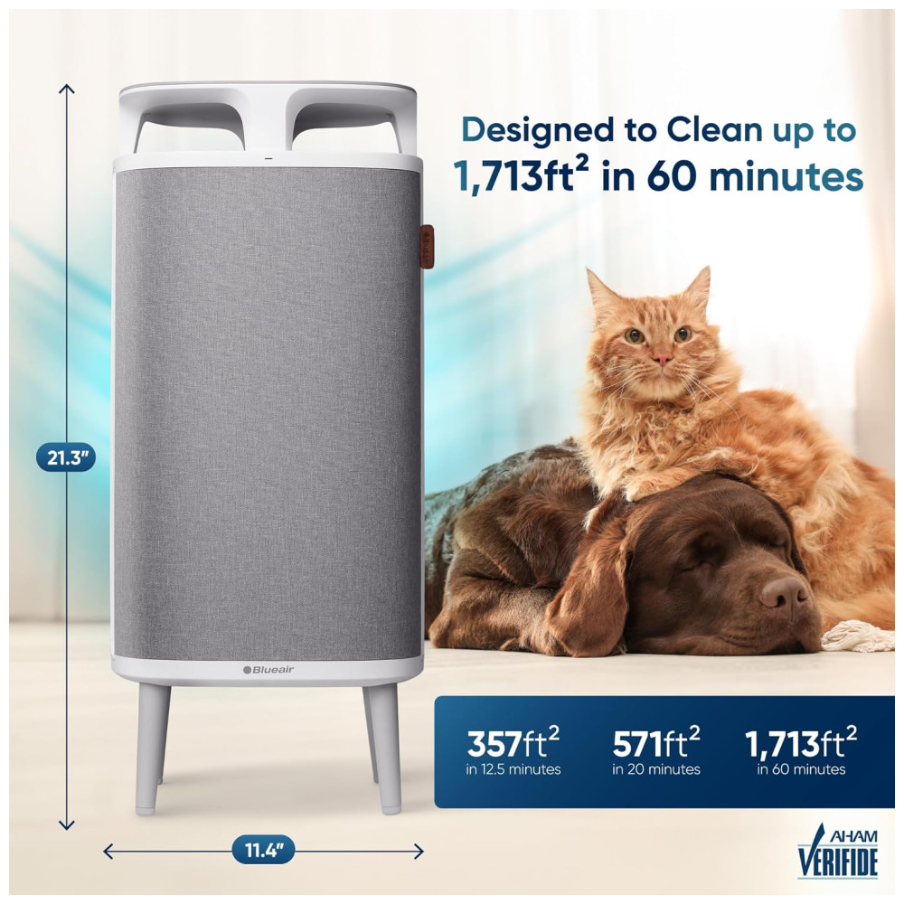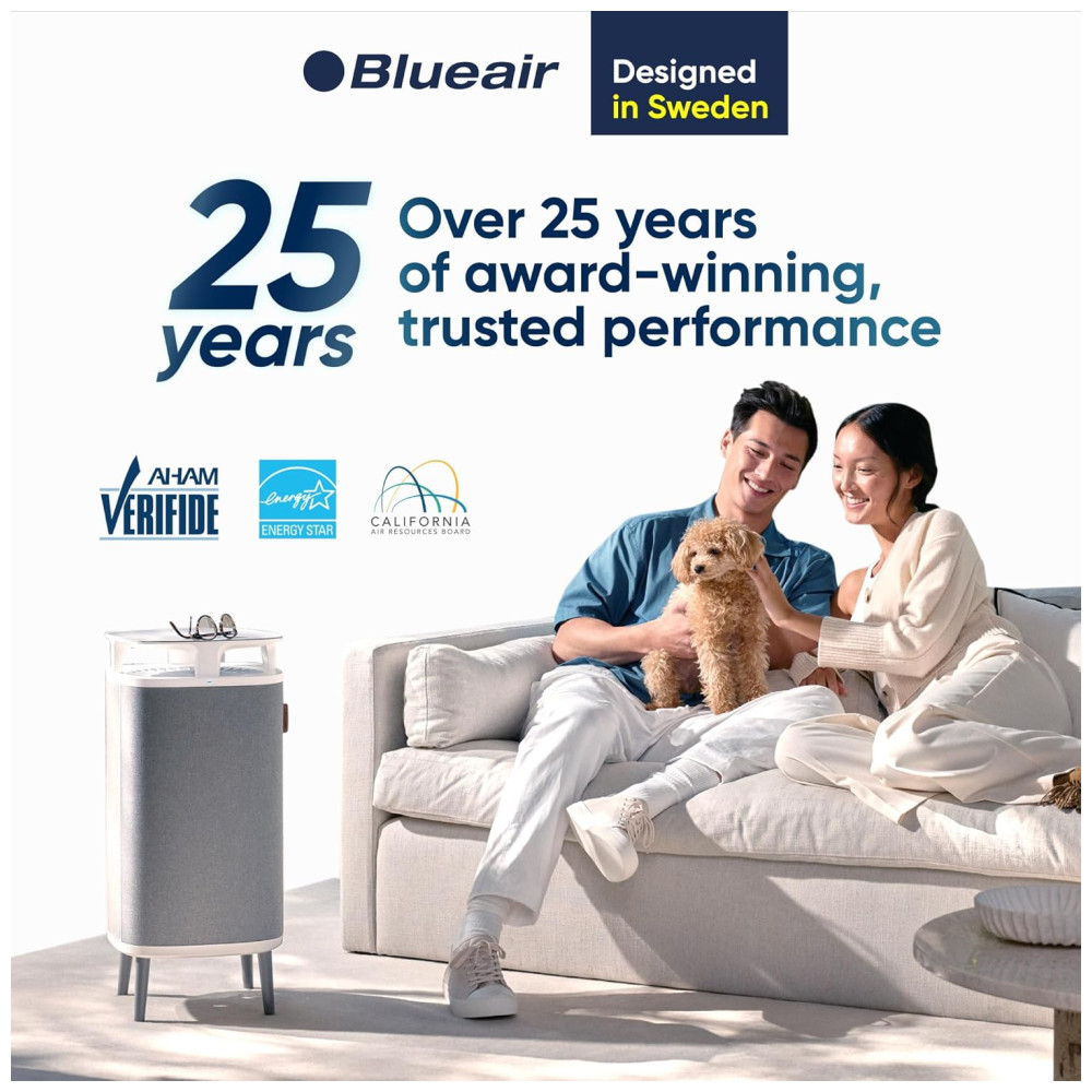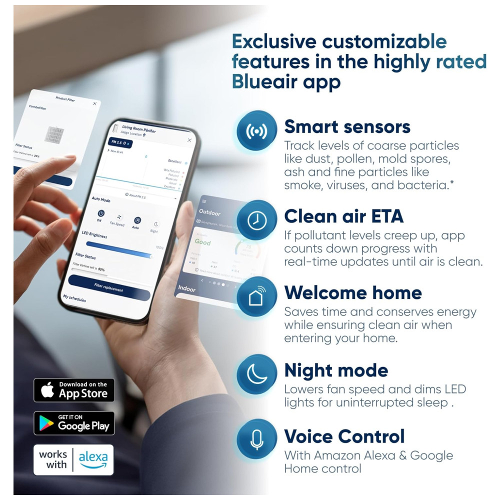 O purificador é compatível com Amazon Alexa e Google Home para controle por voz. Ele também pode ser emparelhado com o aplicativo Blueair, que desbloqueia recursos inteligentes como o Clean Air ETA, que conta o tempo até o ar ficar limpo, e a função Welcome Home, que coloca o purificador em espera quando você sai de casa e o liga novamente antes de seu retorno.