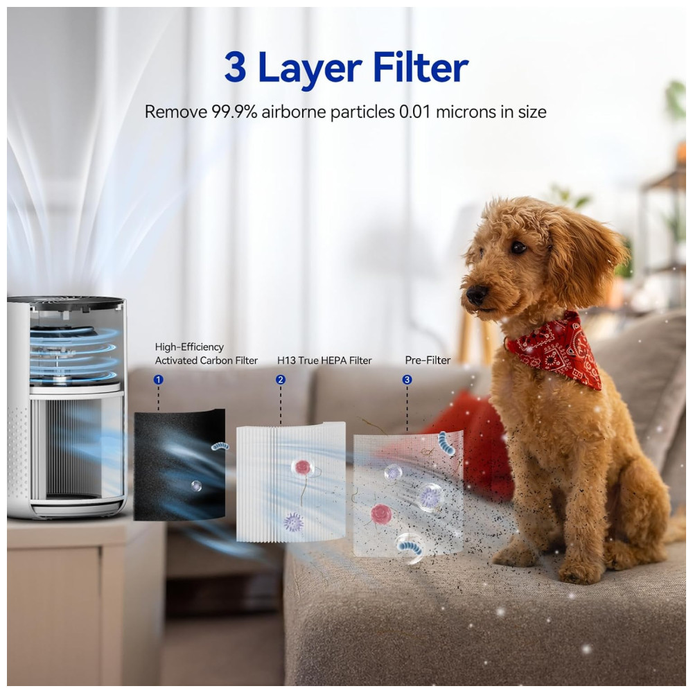 Equipado com um filtro HEPA verdadeiro H13 e um sistema de filtragem de 3 estágios, ele remove 99,9% das partículas transportadas pelo ar com tamanhos de até 0,01 mícron, proporcionando um ar mais limpo e saudável. No modo de espera, opera quase em silêncio, com apenas 20 dB, tornando-o ideal para crianças, idosos e para ambientes onde a tranquilidade é essencial.
