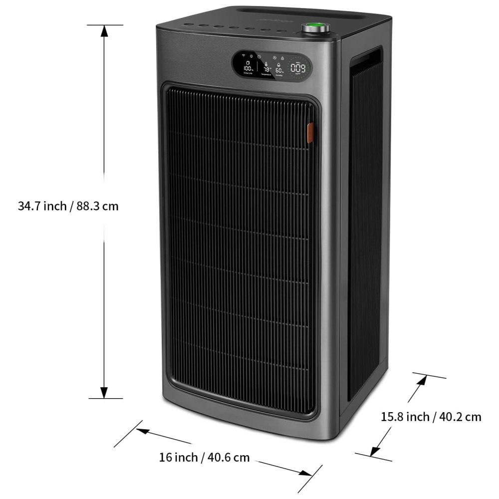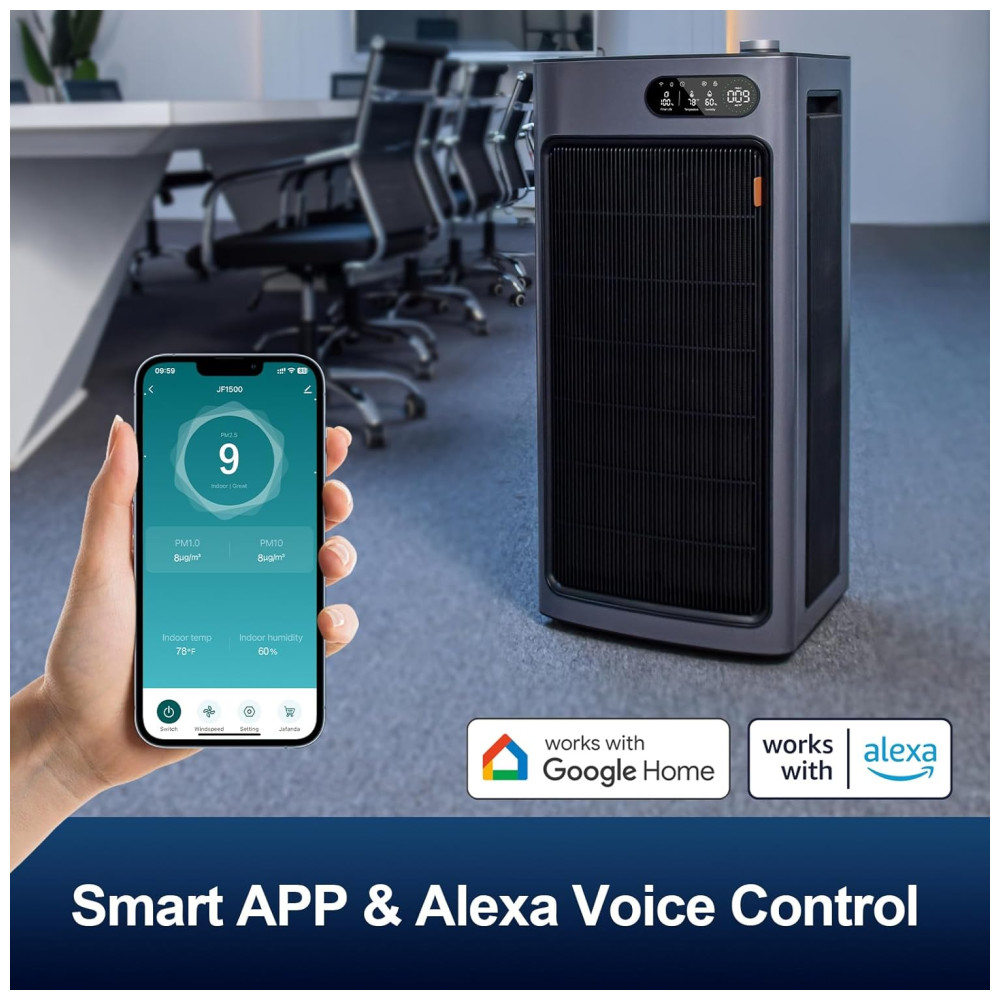 Purificação Inteligente para Seu Conforto: Eleve a qualidade do ar do seu lar com o purificador inteligente do JF1500. Compatível com aplicativos e com controle de voz via Alexa e Google Home, ele conta com um indicador avançado de qualidade do ar que monitora partículas PM1.0, PM2.5, PM10 e umidade. Com opções para ajustar a temperatura em Celsius ou Fahrenheit, programações e temporizadores, você terá sempre um ambiente otimizado e confortável.