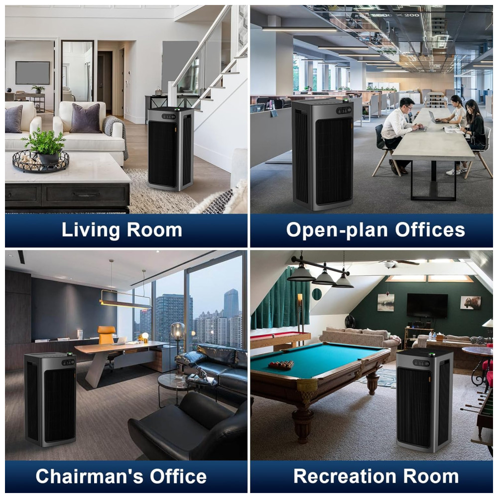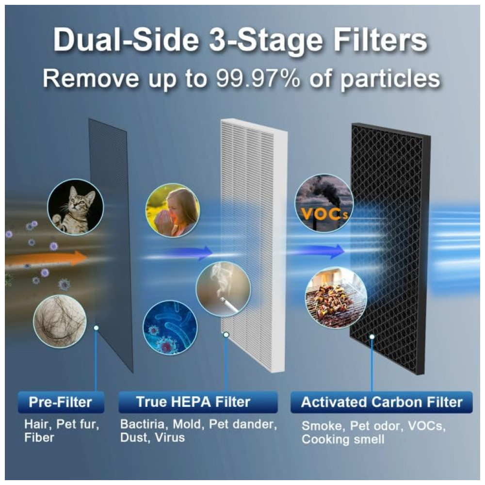 Filtragem Avançada para um Ar Mais Limpo: Desfrute de um ar mais puro com nosso sistema de filtragem dupla de 3 estágios. O filtro HEPA 13 verdadeiro de grau médico e os filtros de carvão ativado removem 99,97% das partículas tão pequenas quanto 0,01 mícrons, incluindo poeira, pólen, esporos de mofo e fumaça. Diga adeus a compostos nocivos como HCHO, VOCs, NO2, SO2, além de odores desagradáveis de fumaça, cozinha e animais de estimação. Mantenha sua casa sempre limpa e fresca!