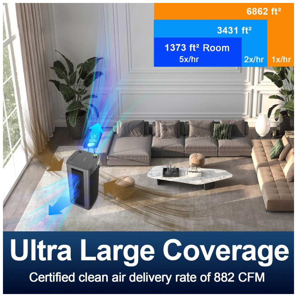 Cobertura Poderosa para Grandes Espaços: O JF1500 é ideal para salas amplas, com tetos altos e ambientes de conceito aberto. Com um CADR excepcional de 882 CFM (1500 m³/h), ele purifica eficazmente até 637m2 em 60 minutos ou 127m2 em apenas 12 minutos. Sinta a diferença em cada canto da sua casa!