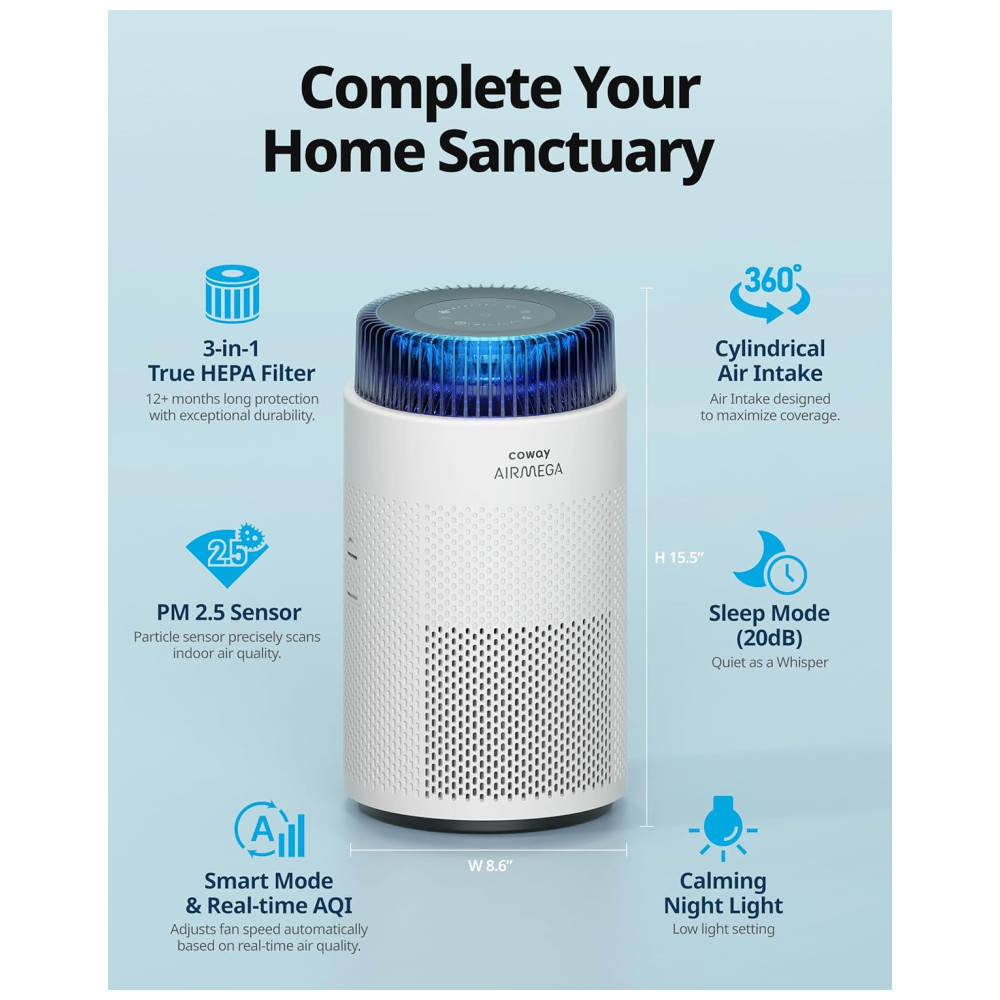 O Coway Airmega 100 é um sistema de filtragem poderoso que utiliza tecnologia True HEPA para reduzir contaminantes no ar. Combinando um pré-filtro, um filtro desodorizante e um filtro True HEPA, ele é capaz de eliminar 99,999% das partículas de até 0,01 mícron, incluindo pólen e alérgenos, além de reduzir 99% dos compostos orgânicos voláteis e odores.