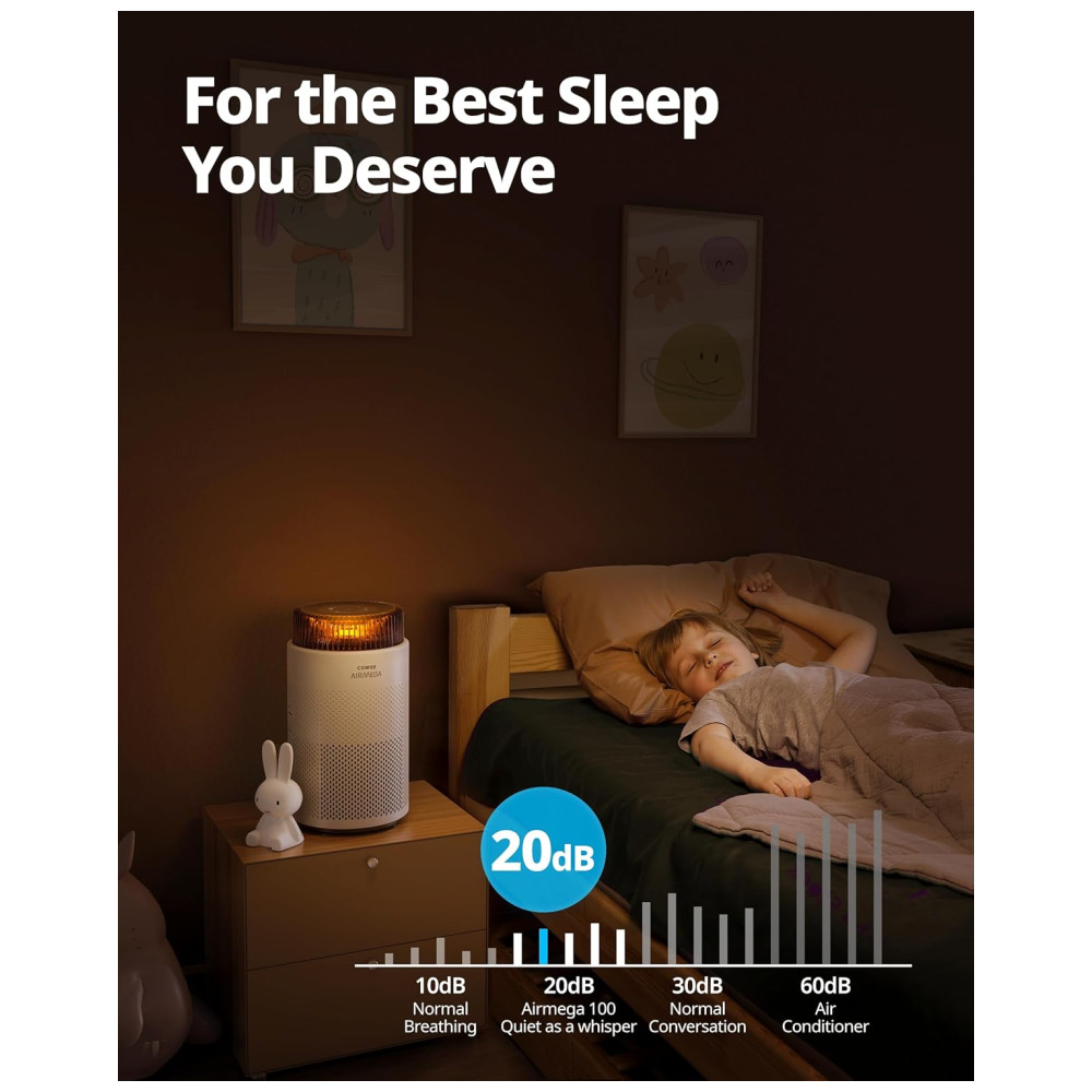 O Airmega 100 é otimizado para purificar espaços de até 75m² em 60 minutos ou 37m² em 30 minutos. Ele possui um indicador intuitivo de qualidade do ar que fornece informações em tempo real, permitindo que você acompanhe a limpeza do ar interno a cada momento.