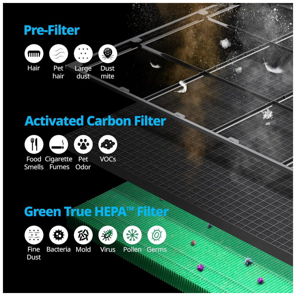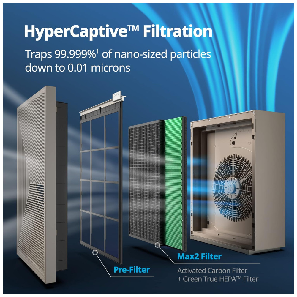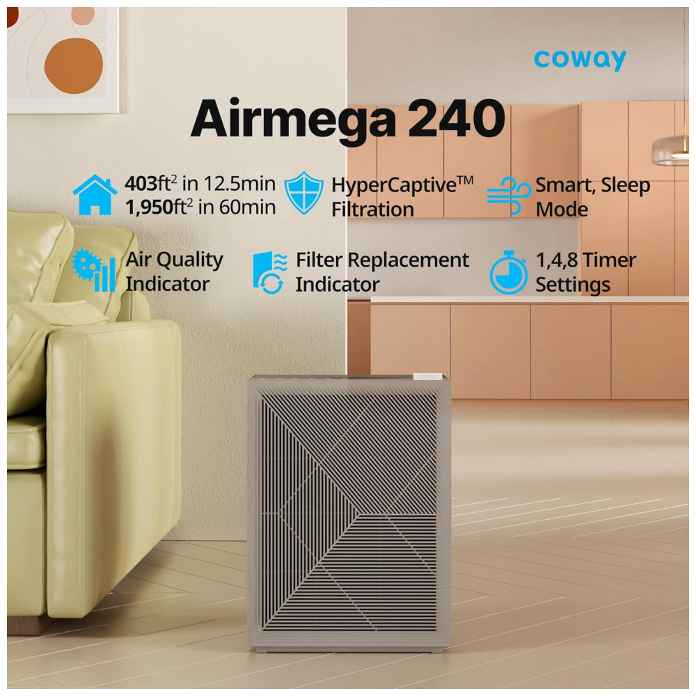 O purificador de ar Coway Airmega 240 é um produto avançado que apresenta um sistema de filtragem HyperCaptive de 3 estágios, composto por um pré-filtro lavável, filtro de carvão ativado e filtro HEPA verdadeiro. Com capacidade para limpar espaços de até 37m² em 12,5 minutos, ou 90 m² em 30 minutos, ele reduz efetivamente 99,999% das partículas de 0,01 mícron no ar, incluindo pólen, poluentes e alérgenos, além de eliminar 99% dos compostos orgânicos voláteis e odores.