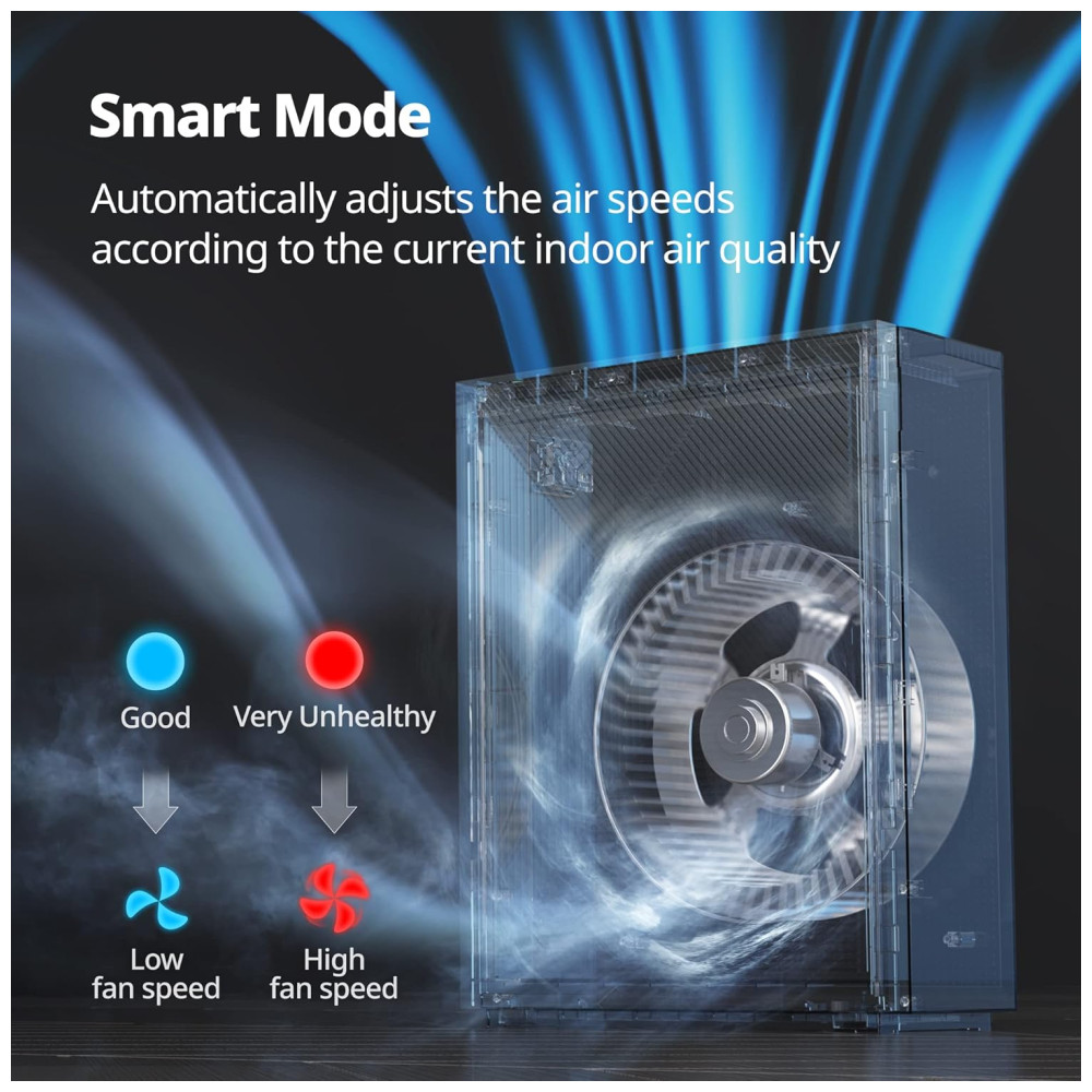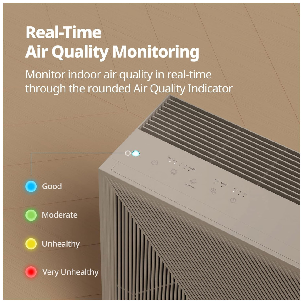 O purificador também conta com tecnologia inteligente, como um indicador de qualidade do ar em tempo real, modo automático e alerta para substituição de filtro, proporcionando um novo nível de limpeza. Com o visor Easy Touch, é possível controlar a velocidade do ventilador, a energia, a luz e a redefinição do filtro com um simples toque.