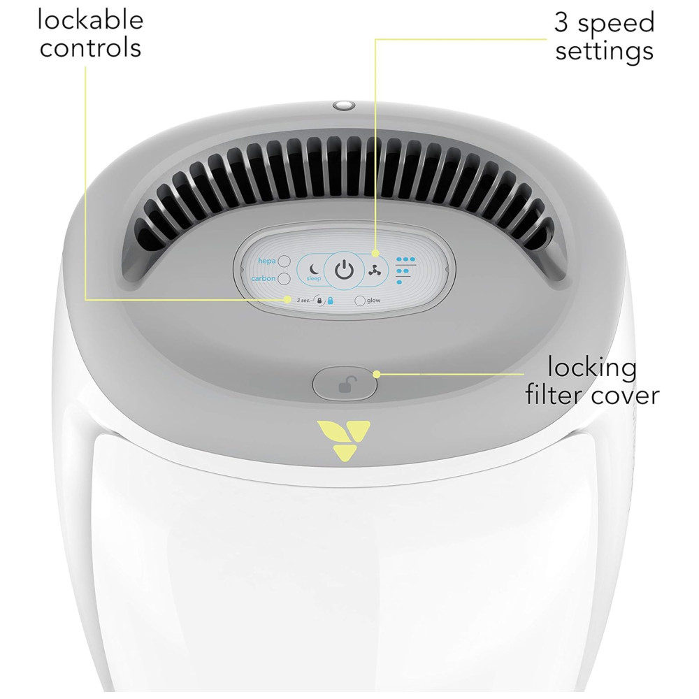 FILTRAGEM EM TRÊS ESTÁGIOS Um filtro de carvão ativado absorve odores e gases, o filtro True HEPA captura 99,97 das partículas transportadas pelo ar, como bactérias, mofo e pêlos de animais, e um pré filtro lavável permanente estende a vida útil do filtro HEPA True. COBERTURA EFICIENTE Purifique todo o ar ao redor do bebê 6, 3 vezes por hora em um espaço de até 125 pés quadrados, deixando um ar limpo e saudável para o berçário do bebê. PROVA DE CURIOSIDADE Purio é confortável para os dedos, sem pontos de aperto e uma base extra larga e resistente a tombamentos. O zenamento do cabo está oculto na base e os controles e a tampa do filtro podem ser travados para que os pais saibam que as configurações permanecem exatamente como as deixaram. OPERAÇÃO FÁCIL COM 3 VELOCIDADES Os controles eletrônicos de três velocidades tornam a operação uma brisa. Escolha uma configuração mais baixa para uma operação mais silenciosa ou uma configuração mais alta para uma limpeza rápida e natural do fluxo de ar que pode funcionar como um elemento de ruído branco. MODO SLEEP , GLOW Use a configuração sleepy time para acalmar automaticamente a configuração mais baixa no escuro. Ligue a iluminação embutida do Purio para um brilho suave e, quando uma troca de filtro for necessária, o recurso de brilho diminuirá e aumentará suavemente.