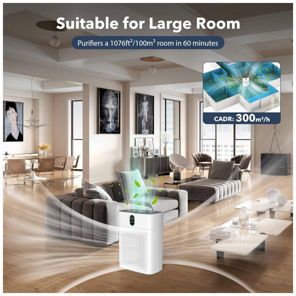 Entrada de ar dupla lateral: Este purificador de ar para salas grandes foi projetado com entradas de ar duplas. Comparado ao design de entrada de ar única, ele realiza trabalhos de purificação em ambos os lados simultaneamente, melhorando significativamente a velocidade de purificação. Nosso purificador de ar para alergias CADR é de até 300 m, h. Para uma sala de 1.076 pés quadrados, 100 metros quadrados, ele pode refrescar o ar a cada hora, proporcionando um ambiente saudável e fresco para respirar na fumaça.