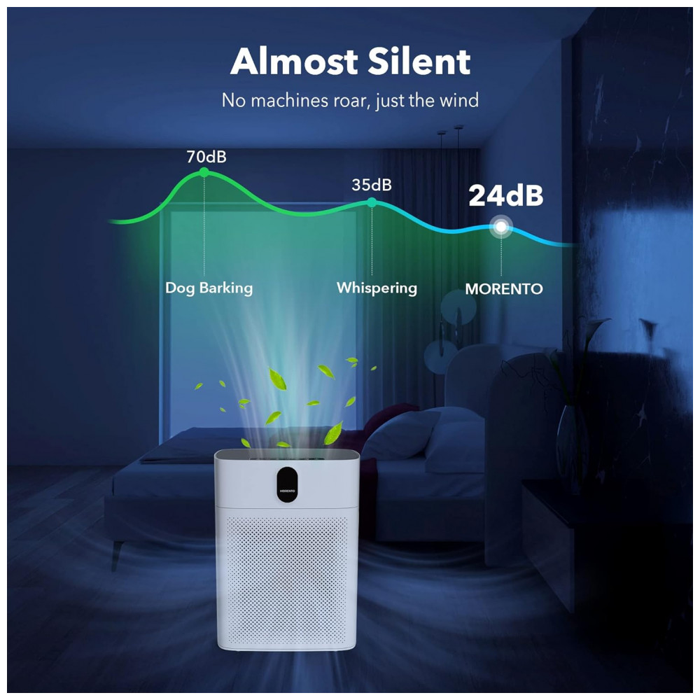 Seu parceiro silencioso: Quando o purificador de ar para pêlos de animais de estimação MORENTO HY4866 para quarto está operando no modo de suspensão, nosso ventilador purificador de ar opera em baixa velocidade com baixo ruído menos de 24dB e todas as luzes indicadoras estão apagadas. Não interferirá no seu doce sono, permitindo que você e sua família desfrutem de ar fresco e limpo em bons sonhos. É um parceiro de sono tranquilo no qual vale a pena investir.