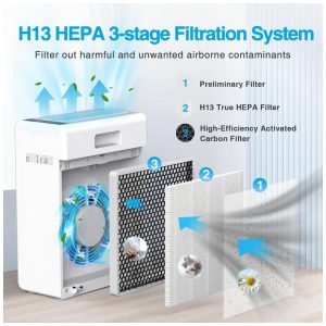 SISTEMA DE FILTRAGEM Avançado de 3 ESTÁGIOS: Equipado com um pré filtro para partículas grandes como fiapos e pelos, um filtro H13 True HEPA que captura quase todas as partículas transportadas pelo ar com tamanho de 0,3 mícron, livrando seu ambiente de poeira, pólen, pêlos de animais e um alto eficiência filtro de carvão ativado para vapores tóxicos e odores desagradáveis. Este purificador de ar doméstico é 100 livre de ozônio, nunca usa luz UV C, que a pesquisa mostrou pode produzir ozônio prejudicial e poluição secundária.