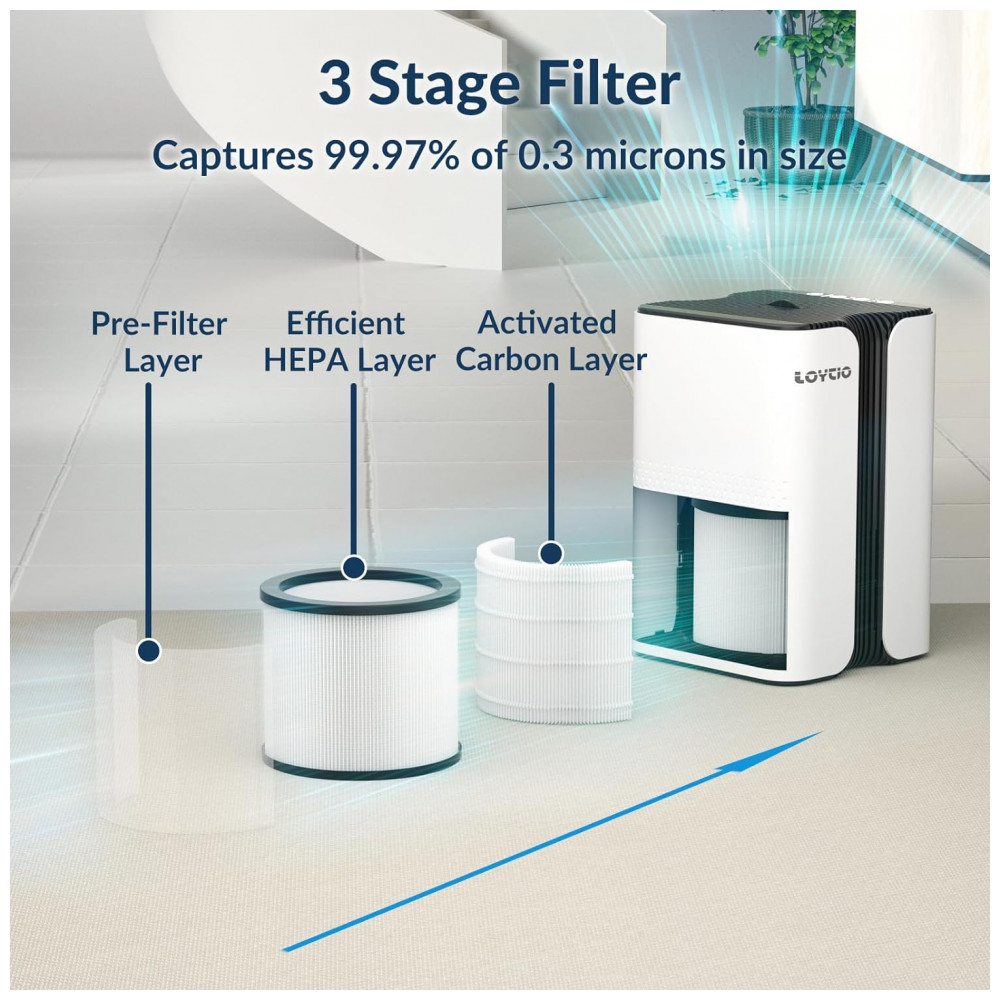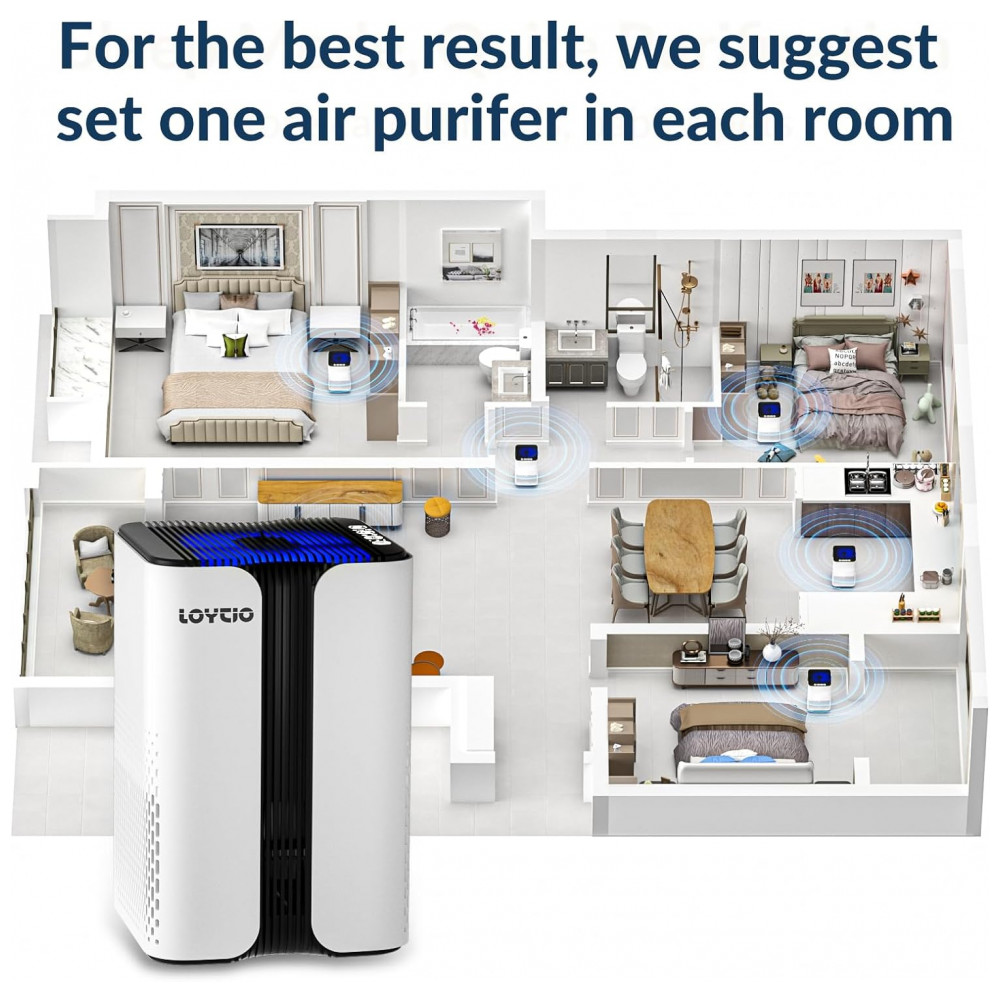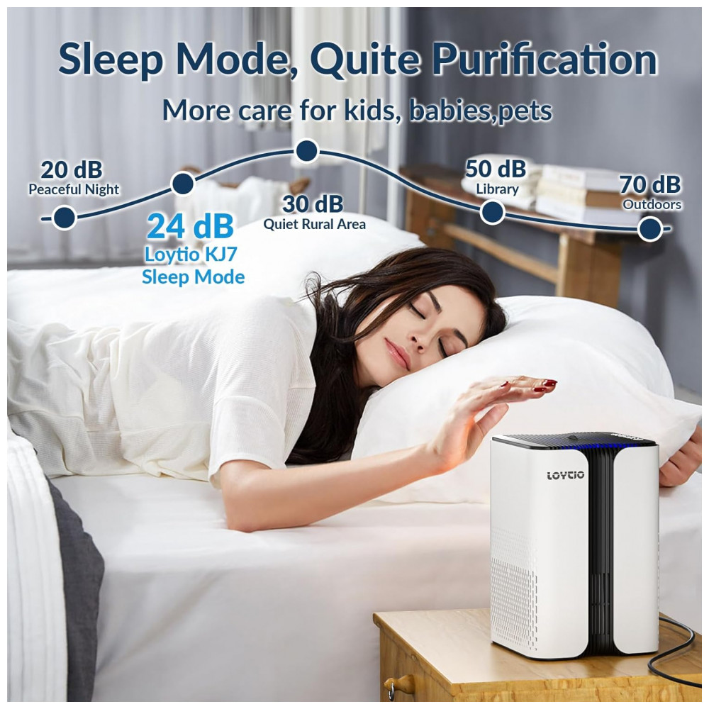 Purificação de ar: Usando filtro de carbono ativo HEPA, pode capturar 99,97 de 0,3 mícrons de tamanho, como PM2,5. Os purificadores de ar Loytio KJ7 são ideais para casa, quarto, dormitório, apartamento, cozinha. Embora nosso purificador de ar funcione muito bem em salas de 18m2 a 37m2, SUGERIMOS definir uma máquina em cada sala para obter o melhor resultado