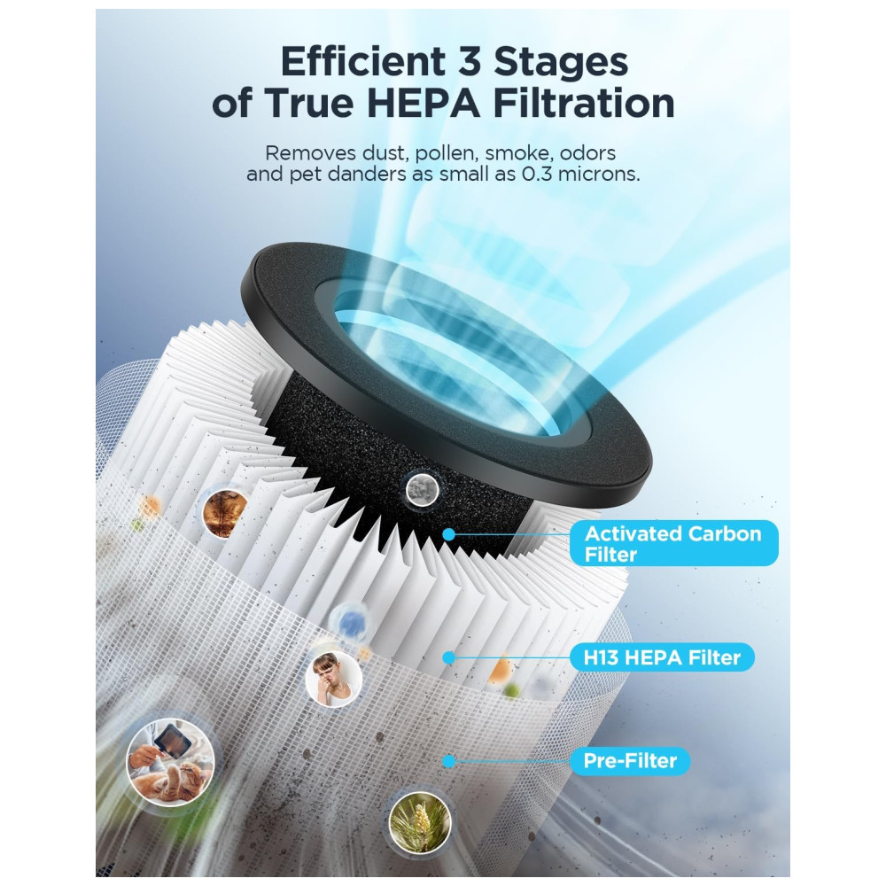 PURIFICADOR DE AR HEPA H13 VERDADEIRO O pré filtro, filtro HEPA verdadeiro H13 e filtro de carvão ativado de alta eficiência capturam alérgenos, pelos de animais, pelos, fumaça, mofo, odor e grandes partículas de poeira, além de remover 99,97 dos contaminantes transportados pelo ar tão pequeno quanto 0,3 mícron. Poderoso e eficiente limpador de filtro de ar evita problemas respiratórios, reações alérgicas e asma.