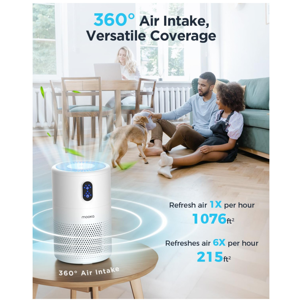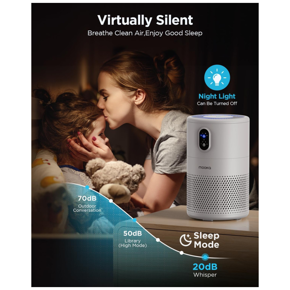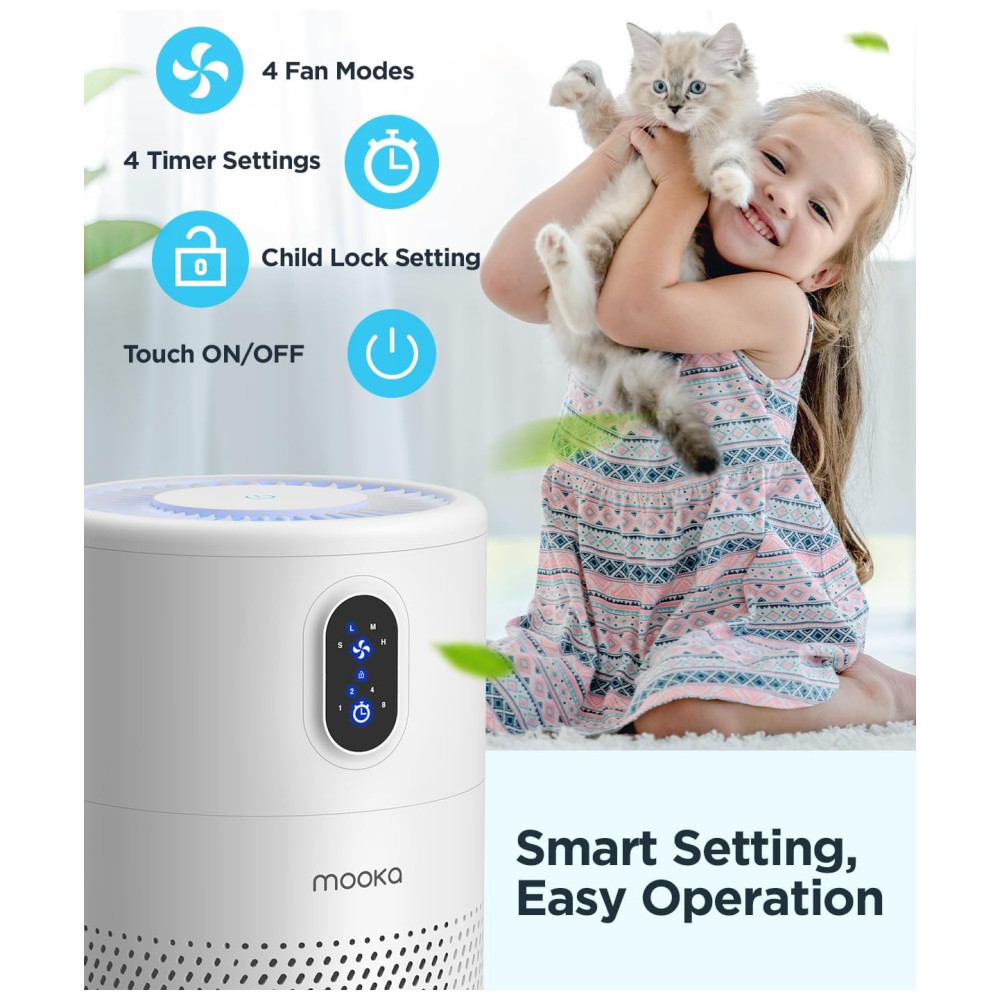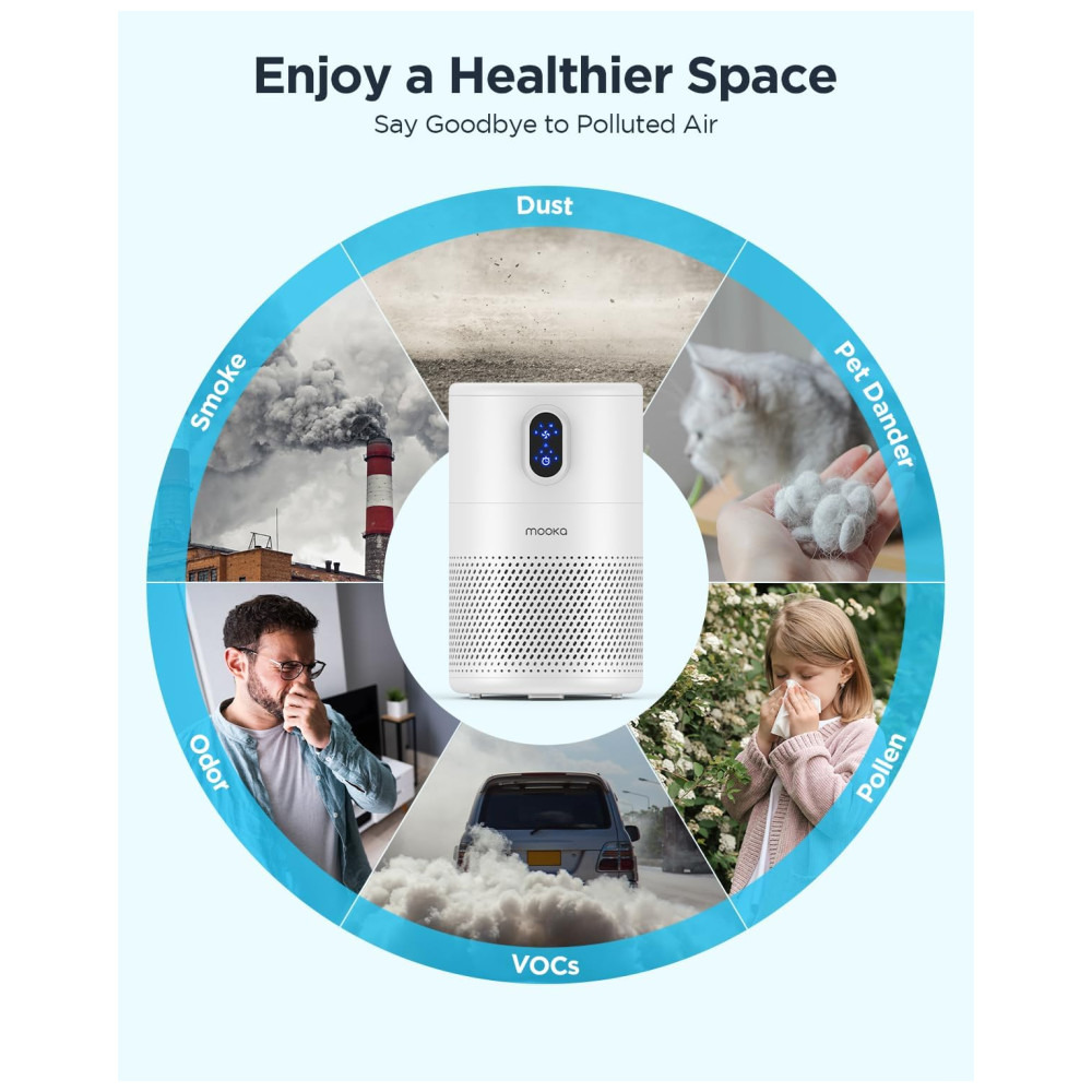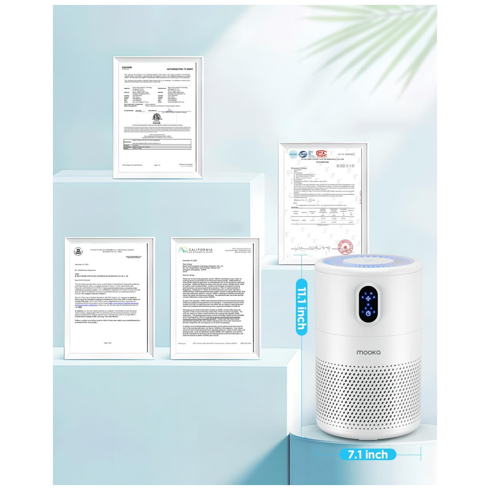 PURIFICADOR DE AR MOOKA B D02L PARA SALA GRANDE Com o sistema de filtragem de alta eficiência, o purificador de ar cobre uma área de até 430 pés 40m. 6 renovações de ar por hora em 215 pés 19m, 3 renovações de ar por hora em 430 pés. O design moderno adapta se a qualquer espaço, desde divisões pequenas a grandes, quartos, salas, escritórios, creches, cozinhas e caves. Perfeito para donos de animais de estimação, alérgicos, bebês, crianças, idosos ou qualquer pessoa que queira melhorar a qualidade do ar.