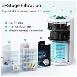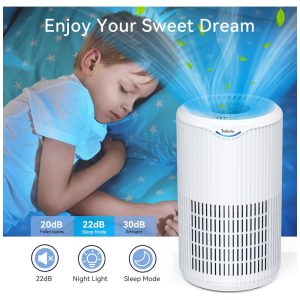 Purificador de ar H13 True HEPA Os purificadores de ar para uso doméstico adotam um sistema de filtragem de 3 estágios, incluindo um pré filtro, filtro H13 HEPA verdadeiro e filtro de carvão ativado, que retém 99,97 das partículas de 0,3 mícron de fumaça, poeira e pólen , PM 2.5, pelos de animais, cheiro de comida e cabelo. Alivie espirros, congestão e outros sintomas de alergia cas por contaminantes transportados pelo ar de forma eficaz.