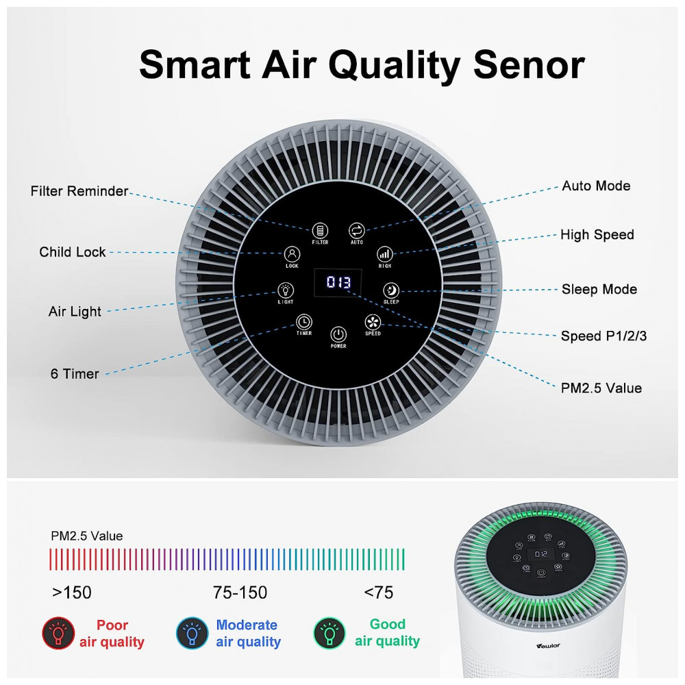 Monitoramento inteligente da qualidade do ar com luz O monitoramento da qualidade do ar é uma das maiores características deste purificador de ar VEWIOR. E o sensor de qualidade do ar integrado pode detectar de forma inteligente o valor PM2,5 circundante. A purificação é claramente visível. Possui três cores de luzes de qualidade do ar, com o botão Light controlando liga , desliga, que representam qualidade do ar excelente verde, boa azul e ruim vermelho.