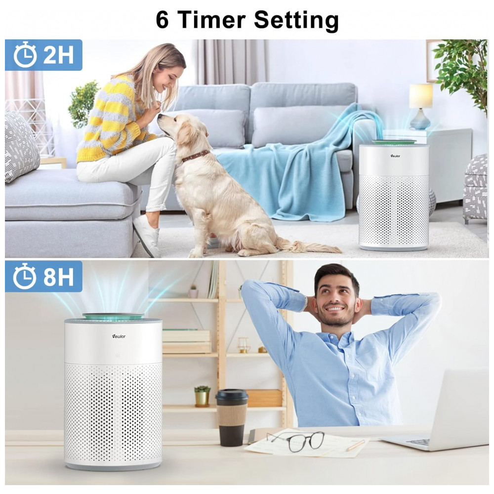 Purificação eficiente do filtro H13 HEPA O purificador de ar VEWIOR usa um filtro H13 True HEPA e possui certificação CARB internacional, certificação FCC, certificação ETL, etc., para que possa filtrar facilmente partículas tão pequenas quanto 0,2 mícrons no ar, como poeira, fumaça, pólen, cabelo e odor. Apresentando entrada de ar de 360 e saída superior, o purificador de ar A2 refresca o ar 5x por hora em áreas de até 144,93 metros quadrados em uma hora.