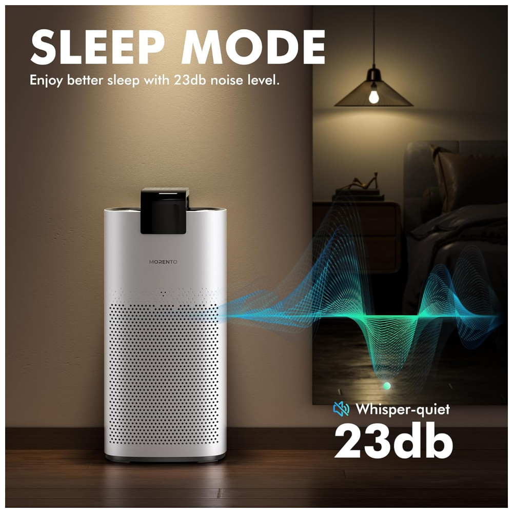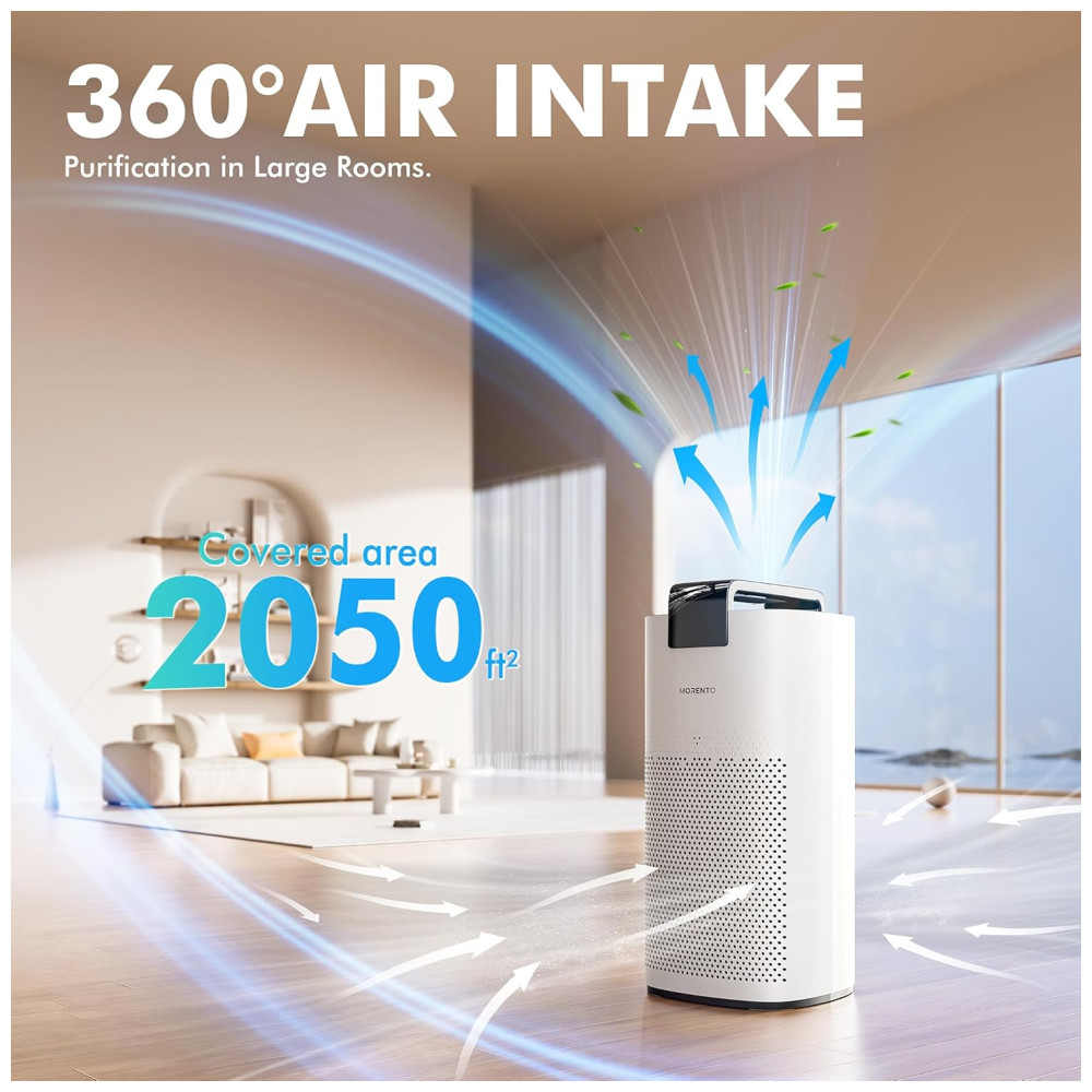 O Purificador de Ar MORENTO é um dispositivo potente e eficiente, projetado para purificar o ar em ambientes grandes, com capacidade de limpar até 190m2 por hora. Ele apresenta uma taxa de purificação do ar de até CADR 460 m³/h e CFM de 270.