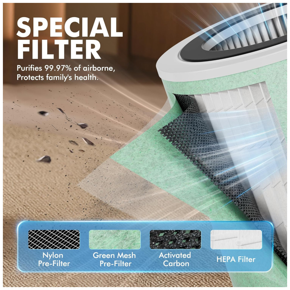 Este purificador possui um sistema de filtragem 4 em 1 que elimina até 99,9% das pequenas partículas transportadas pelo ar, incluindo pólen, poeira e fumaça, além de remover odores indesejados, como os de animais de estimação e gordura de cozinha. O sensor PM2.5 integrado permite a detecção em tempo real da qualidade do ar, com luzes indicativas que mostram instantaneamente a limpeza do ambiente.