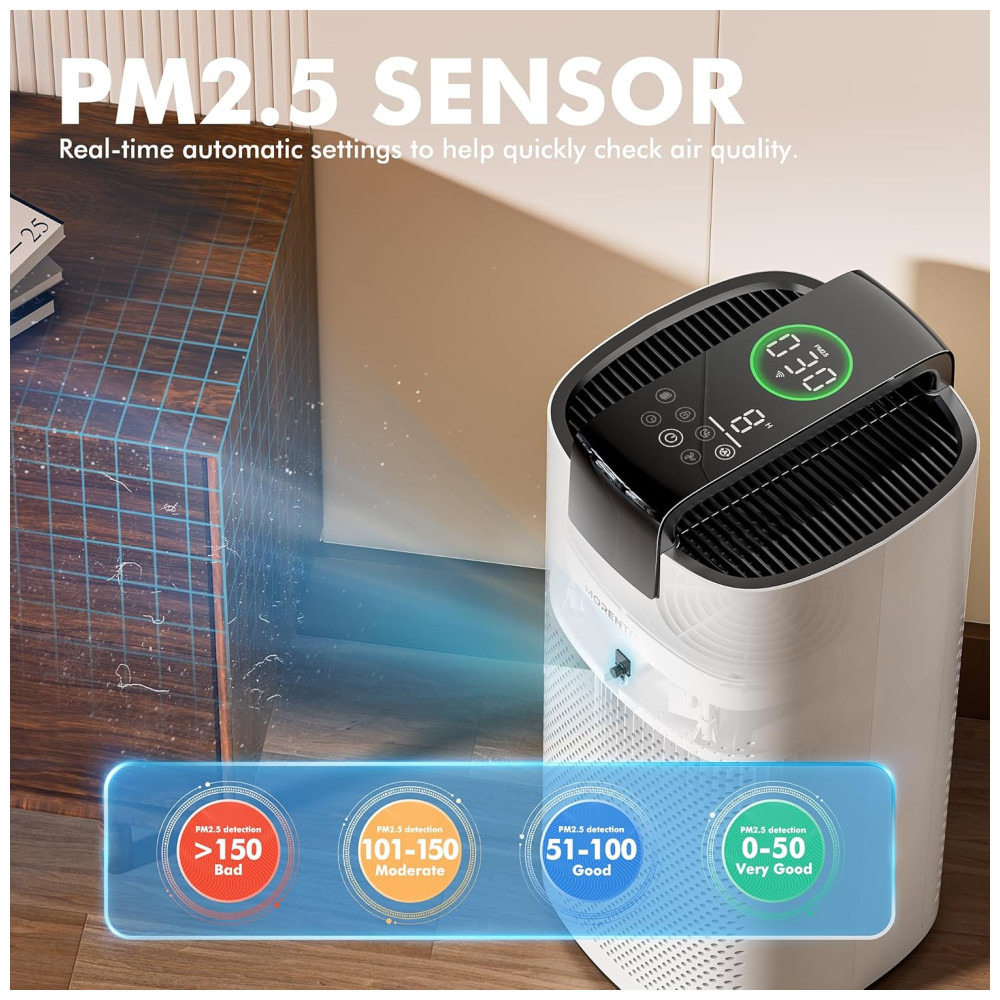 Purificador de Ar Portátil para Ambientes até 190m² com Filtro HEPA Sensor de Qualidade Modo de Espera e Controle por APP via WiFi 110V MORENTO MR7566-WF Branco