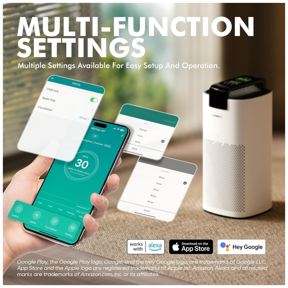 O design portátil e elegante facilita a movimentação do purificador entre diferentes áreas da casa. Ele é capaz de realizar cinco trocas de ar por hora, garantindo um ambiente sempre fresco e limpo. O purificador é controlável por meio de um aplicativo com função Wi-Fi, permitindo ajustes remotos, e também pode ser operado por voz via Alexa e Google Home.