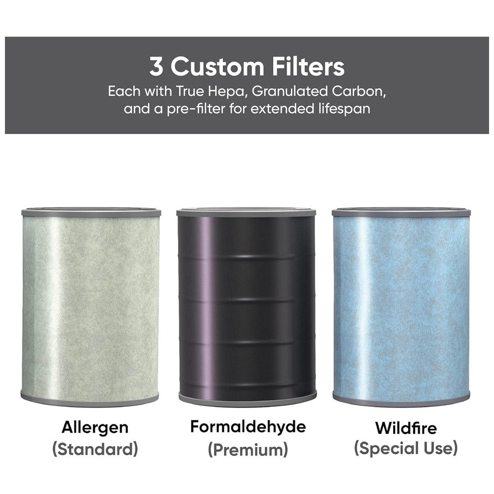 Este poderoso purificador de ar é capaz de limpar salas grandes, como quartos, salas de estar, cozinhas e porões, com uma capacidade de purificação de 350 mh CADR. Possui três opções de filtro disponíveis padrão, especial e premium, que visam partículas alvo, pólen, odor, fumaça, cinzas, cheiro de fumaça e formaldeído, além de o sensor de poeira a laser verificar a qualidade do ar circundante em busca de partículas transportadas pelo ar, medindo a qualidade do ar até 0,3 mícrons e ajustando automaticamente. Ele também é muito silencioso, com um nível de ruído de apenas 21,0 DB no modo de sono e 54,0 DB no modo alto, e possui controles inteligentes completos com rastreamento AQ interno e externo detalhado e fácil de ler, incluindo um controle remoto completo.